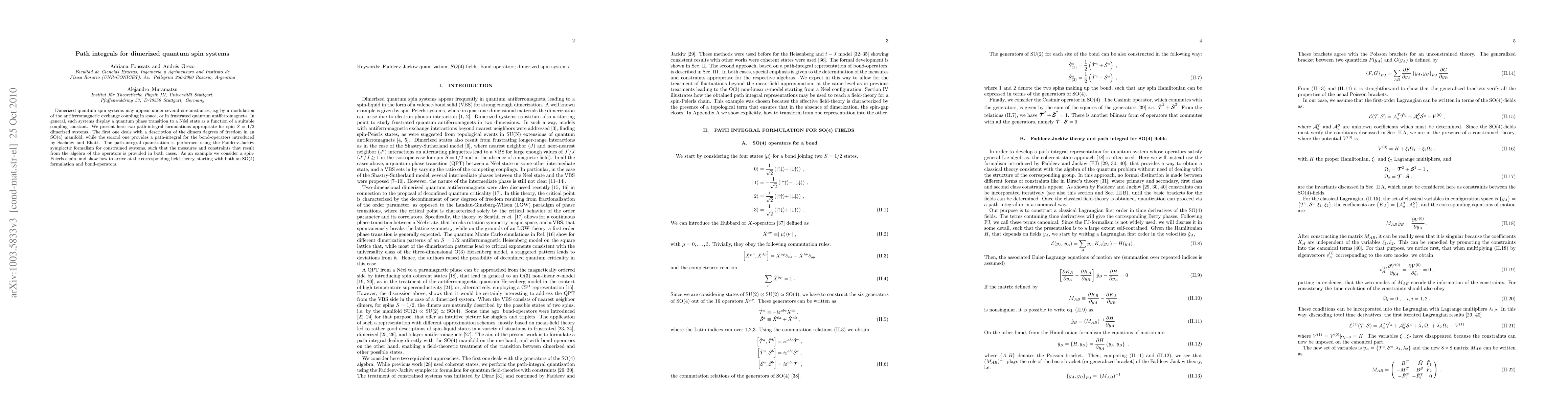 Dimerized quantum spin systems may appear under several circumstances, e.g\ by a modulation of the antiferromagnetic exchange coupling in space, or in frustrated quantum antiferromagnets. In general, such systems display a quantum phase transition to a N\'eel state as a function of a suitable coupling constant. We present here two path-integral formulations appropriate for spin $S=1/2$ dimerized systems. The first one deals with a description of the dimers degrees of freedom in an SO(4) manifold, while the second one provides a path-integral for the bond-operators introduced by Sachdev and Bhatt. The path-integral quantization is performed using the Faddeev-Jackiw symplectic formalism for constrained systems, such that the measures and constraints that result from the algebra of the operators is provided in both cases. As an example we consider a spin-Peierls chain, and show how to arrive at the corresponding field-theory, starting with both a SO(4) formulation and bond-operators.