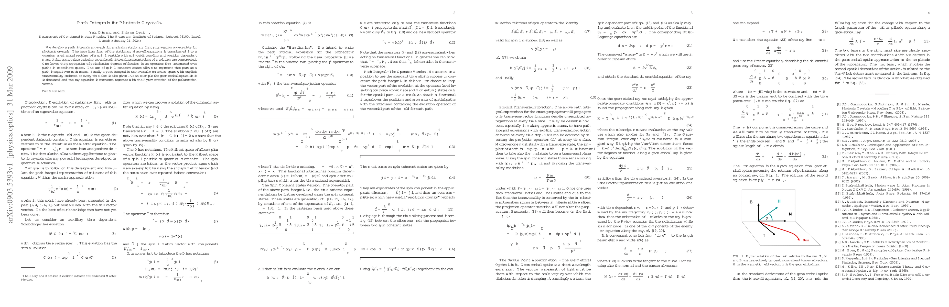 We develop a path integrals approach for analyzing stationary light propagation appropriate for photonic crystals. The hermitian form of the stationary Maxwell equations is transformed into a quantum mechanical problem of a spin 1 particle with spin-orbit coupling and position dependent mass. After appropriate ordering several path integral representations of a solution are constructed. One leaves the propagation of polarization degrees of freedom in an operator form integrated over paths in coordinate space. The use of spin 1 coherent states allows to represent this part as a path integral over such states. Finally a path integral in transversal momentum space with explicit transversality enforced at every time slice is also given. As an example the geometrical optics limit is discussed and the ray equation is recovered together with the Rytov rotation of the polarization vector.