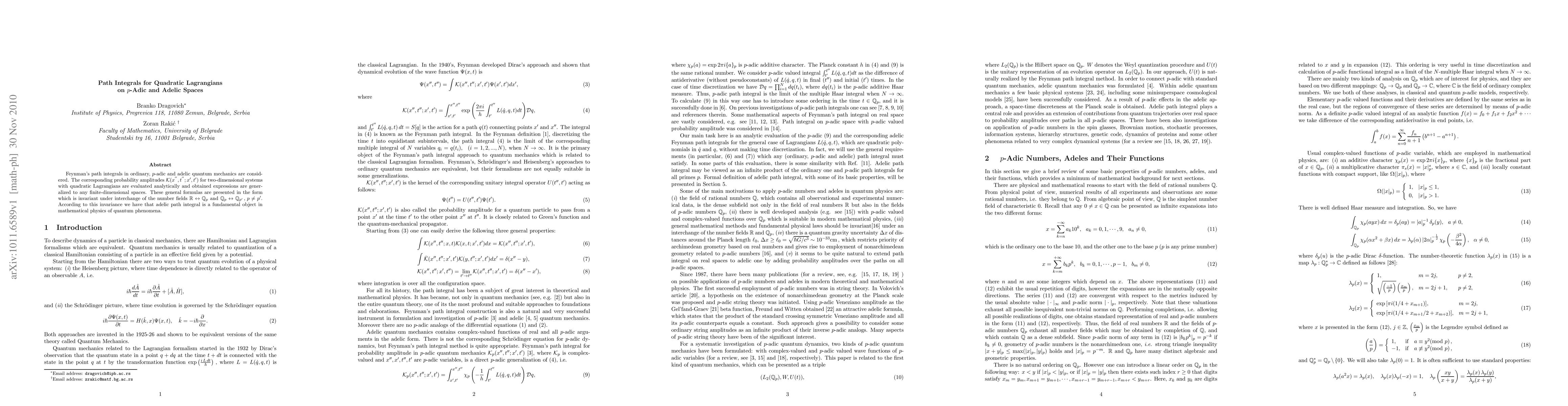 This paper evaluates Feynman's path integrals for quadratic Lagrangians in ordinary, p-adic, and adelic quantum mechanics, deriving generalized expressions invariant under field interchanges. It highlights the fundamental role of adelic path integrals in the mathematical physics of quantum phenomena.