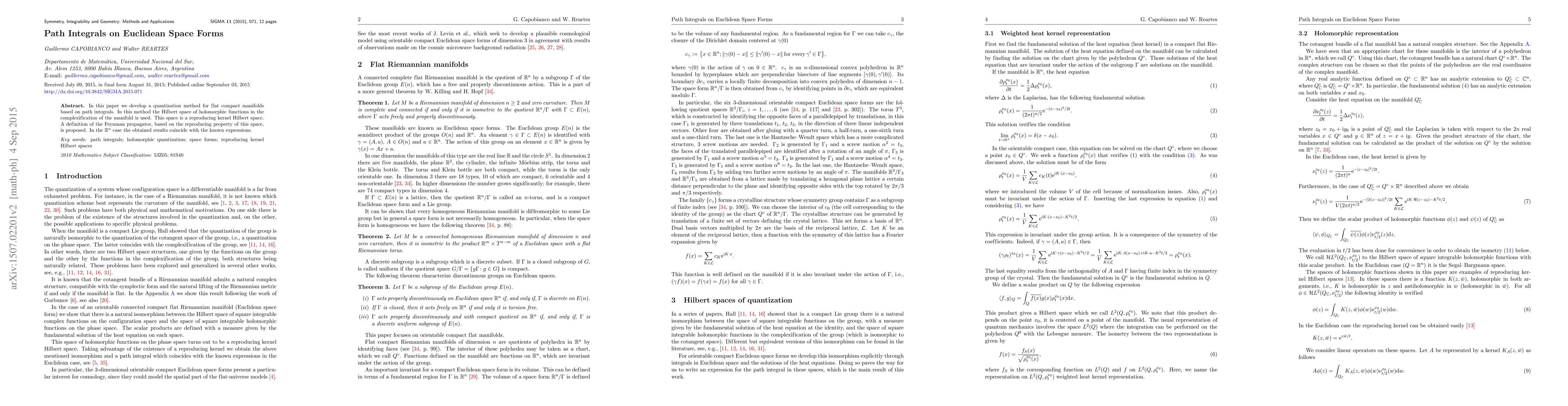 This paper proposes a quantization method for flat compact manifolds using path integrals, employing a Hilbert space of holomorphic functions. The method defines a Feynman propagator through the reproducing kernel property, and results match known expressions in Euclidean space.