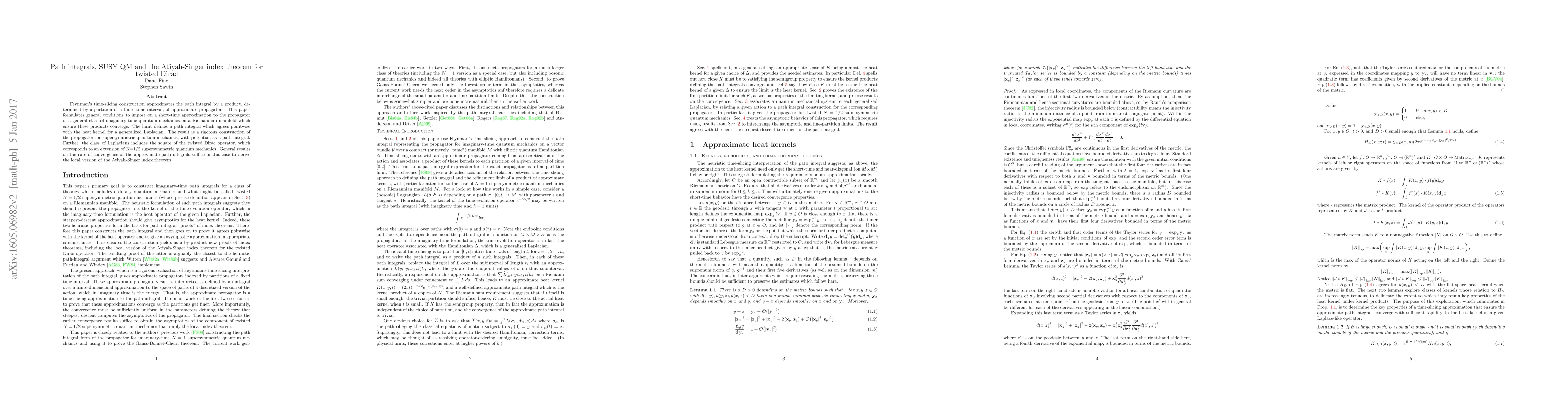 Feynman's time-slicing construction approximates the path integral by a product, determined by a partition of a finite time interval, of approximate propagators. This paper formulates general conditions to impose on a short-time approximation to the propagator in a general class of imaginary-time quantum mechanics on a Riemannian manifold which ensure these products converge. The limit defines a path integral which agrees pointwise with the heat kernel for a generalized Laplacian. The result is a rigorous construction of the propagator for supersymmetric quantum mechanics, with potential, as a path integral. Further, the class of Laplacians includes the square of the twisted Dirac operator, which corresponds to an extension of N=1/2 supersymmetric quantum mechanics. General results on the rate of convergence of the approximate path integrals suffice in this case to derive the local version of the Atiyah-Singer index theorem.