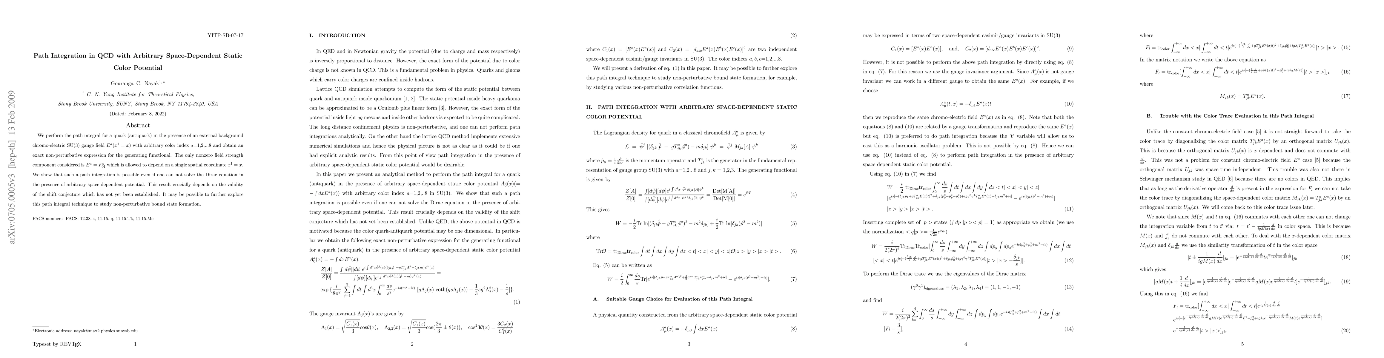 We perform path integral for a quark (antiquark) in the presence of an arbitrary space-dependent static color potential A^a_0(x)(=-\int dx E^a(x)) with arbitrary color index a=1,2,...8 in SU(3) and obtain an exact non-perturbative expression for the generating functional. We show that such a path integration is possible even if one can not solve the Dirac equation in the presence of arbitrary space-dependent potential. It may be possible to further explore this path integral technique to study non-perturbative bound state formation.