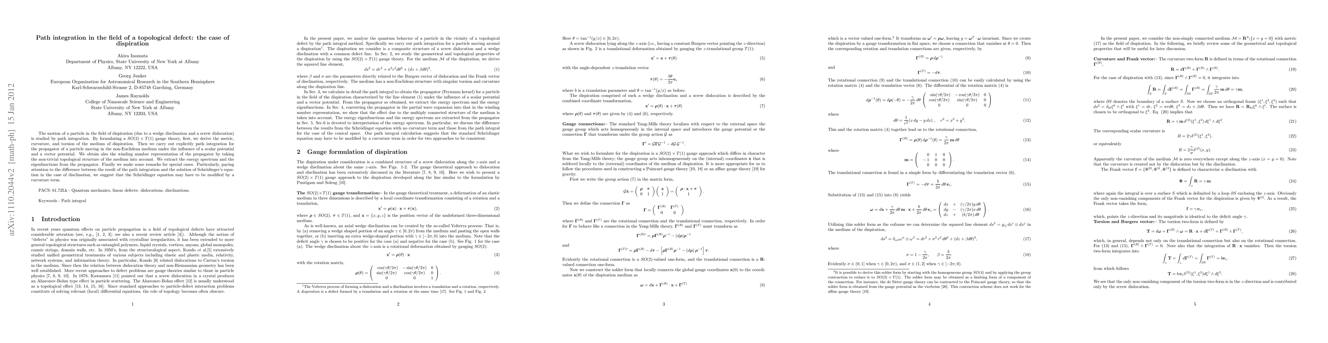 This paper investigates the motion of a particle in a medium with dispiration due to a wedge disclination and screw dislocation using path integration. It derives the metric, curvature, and torsion of the medium and finds the propagator, energy spectrum, and eigenfunctions, suggesting a possible modification to Schrödinger's equation to account for curvature.
