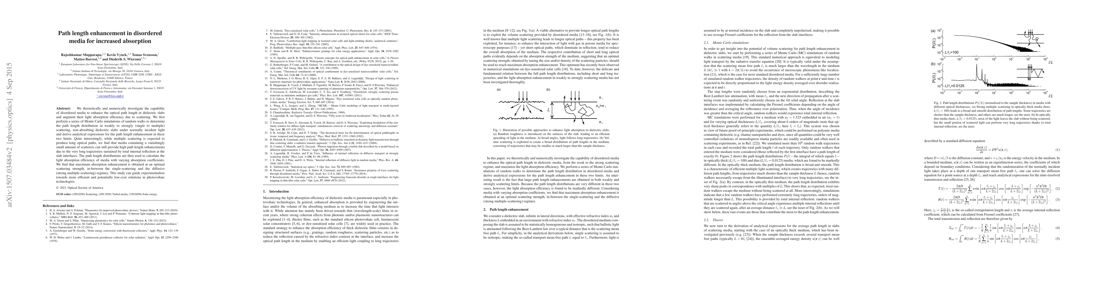 This paper investigates how disordered media can enhance optical path length and absorption efficiency through scattering, finding that even minimal scattering can significantly increase path length due to total internal reflection. The study reveals an optimal scattering strength for maximum absorption enhancement, offering insights for improving photovoltaic technologies.