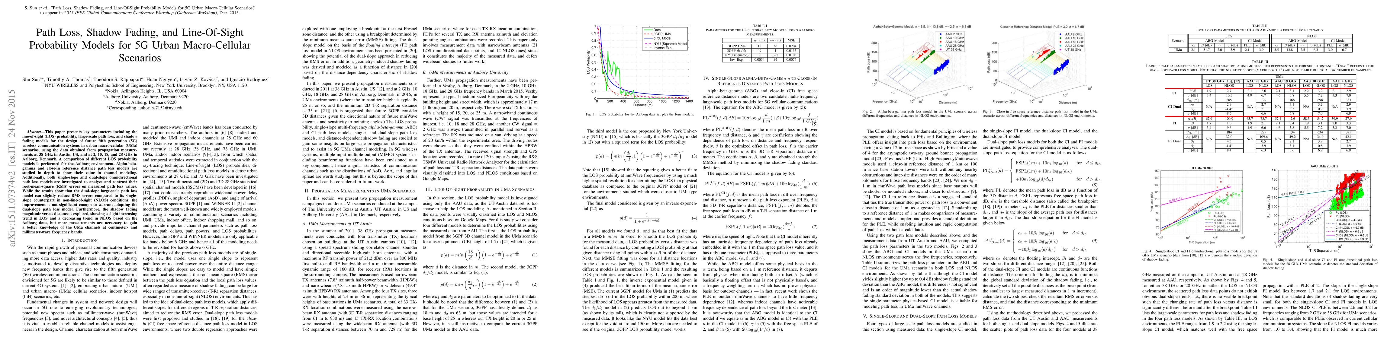 This paper develops key parameters for 5G urban macro-cellular scenarios, including line-of-sight probability, path loss, and shadow fading models, based on propagation measurements at various frequencies. The dual-slope path loss model shows minor improvements over the single-slope model in non-line-of-sight conditions, though not significant enough for preference.