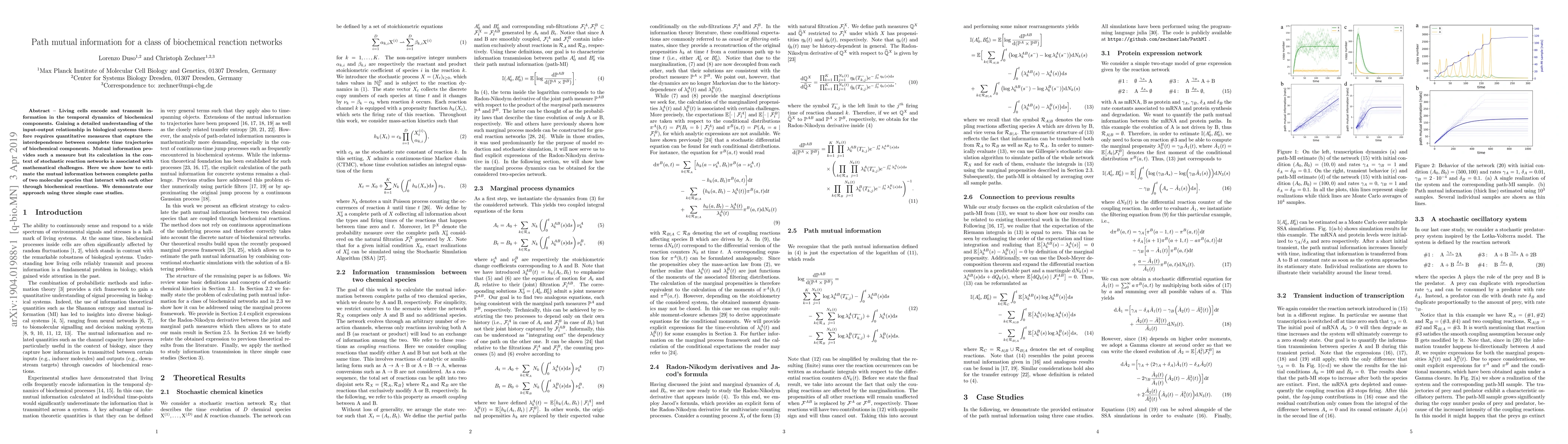 Living cells encode and transmit information in the temporal dynamics of biochemical components. Gaining a detailed understanding of the input-output relationship in biological systems therefore requires quantitative measures that capture the interdependence between complete time trajectories of biochemical components. Mutual information provides such a measure but its calculation in the context of stochastic reaction networks is associated with mathematical challenges. Here we show how to estimate the mutual information between complete paths of two molecular species that interact with each other through biochemical reactions. We demonstrate our approach using three simple case studies.