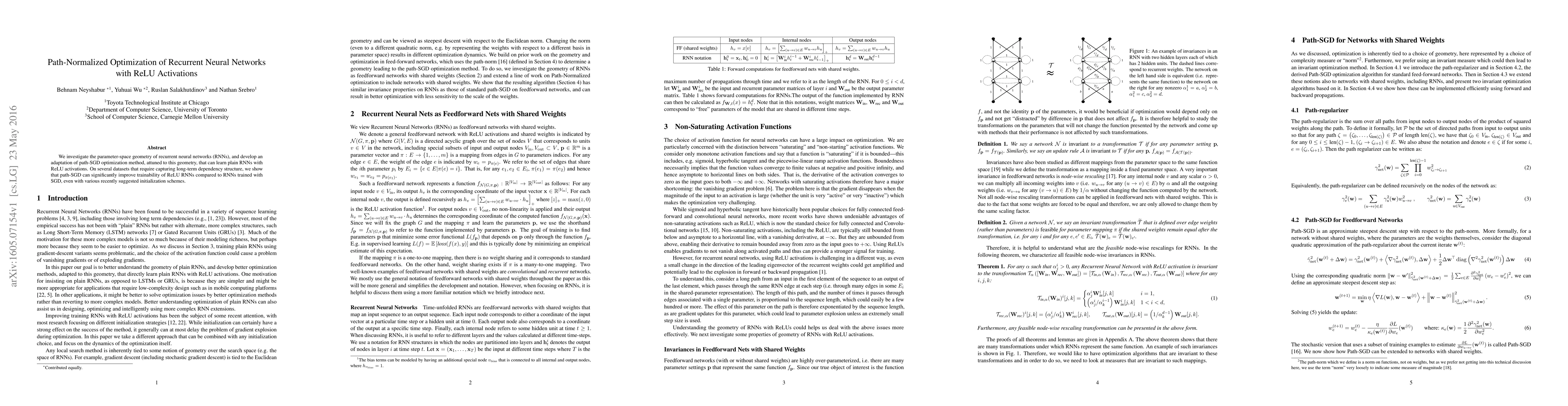 We investigate the parameter-space geometry of recurrent neural networks (RNNs), and develop an adaptation of path-SGD optimization method, attuned to this geometry, that can learn plain RNNs with ReLU activations. On several datasets that require capturing long-term dependency structure, we show that path-SGD can significantly improve trainability of ReLU RNNs compared to RNNs trained with SGD, even with various recently suggested initialization schemes.