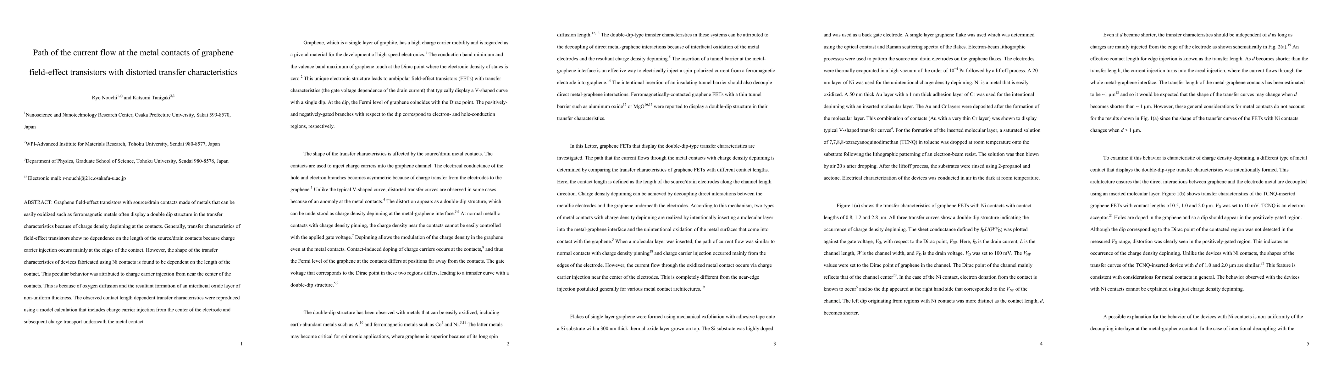 This study investigates the path of current flow in graphene field-effect transistors with Ni metal contacts, revealing a dependency on contact length due to charge carrier injection from the contact center caused by oxide layer formation. The observed double dip in transfer characteristics is modeled, demonstrating the significance of this mechanism.