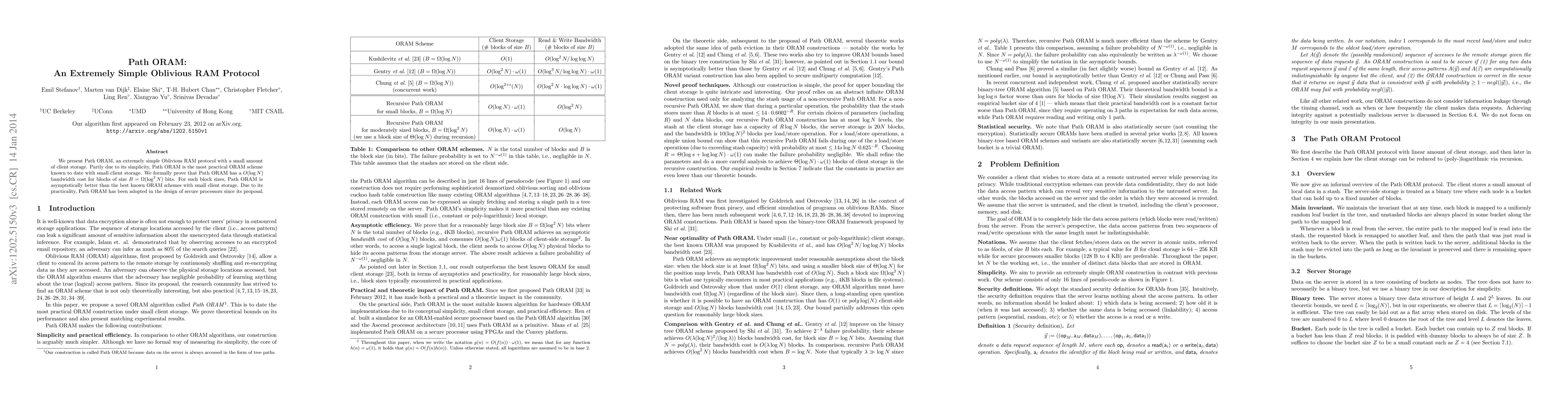 Path ORAM is a highly practical and simple Oblivious RAM protocol requiring minimal client storage. It achieves O(log N) bandwidth cost for sufficiently large block sizes, outperforming other known ORAM schemes with small storage.