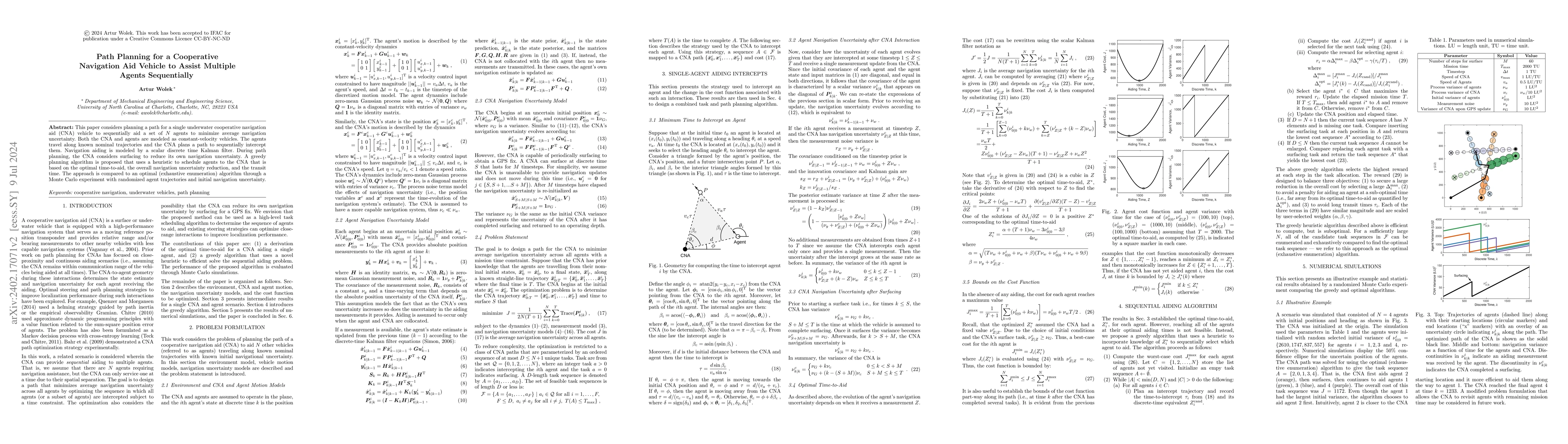 This paper considers the problem of planning a path for a single underwater cooperative navigation aid (CNA) vehicle to intermittently aid a set of N agents to minimize average navigation uncertainty. Both the CNA and agents are modeled as constant-velocity vehicles. The agents traverse along known nominal trajectories and the CNA plans a path to sequentially intercept them. Navigation aiding is modeled by a scalar discrete time Kalman filter. During path planning, the CNA considers surfacing to reduce its own navigation uncertainty. A greedy planning algorithm is proposed that uses a heuristic based on an optimal time-to-aid, overall navigation uncertainty reduction, and transit time, to assign agents to the CNA. The approach is compared to an optimal (exhaustive enumeration) algorithm through a Monte Carlo experiment with randomized agent nominal trajectories and initial navigation uncertainty.