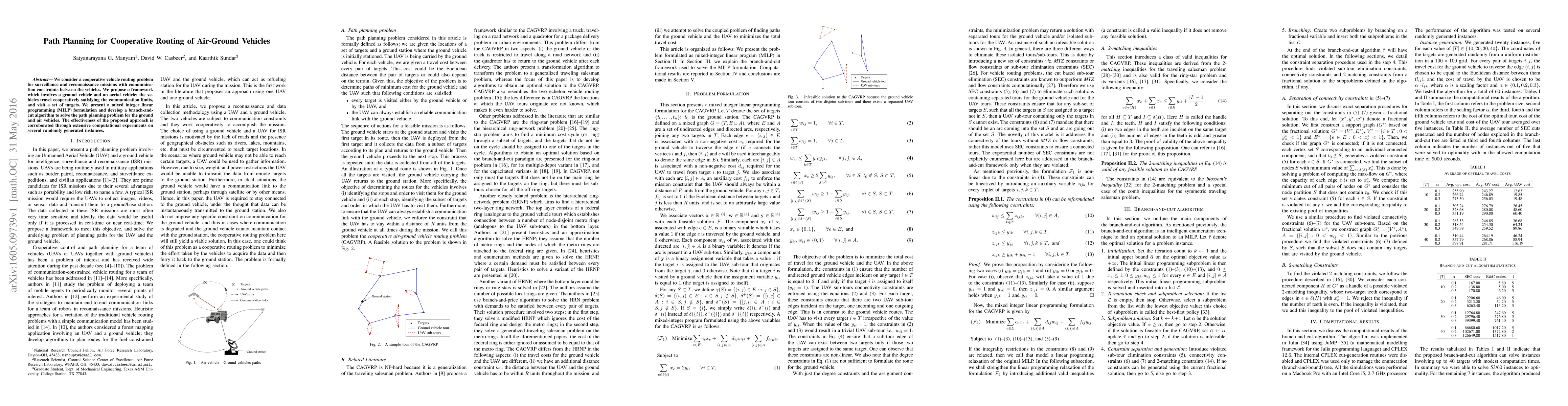 This paper proposes a framework for cooperative routing of air-ground vehicles for surveillance missions, incorporating communication constraints. It utilizes mixed integer linear programming and a branch-and-cut algorithm to solve the path planning problem, validated through computational experiments.