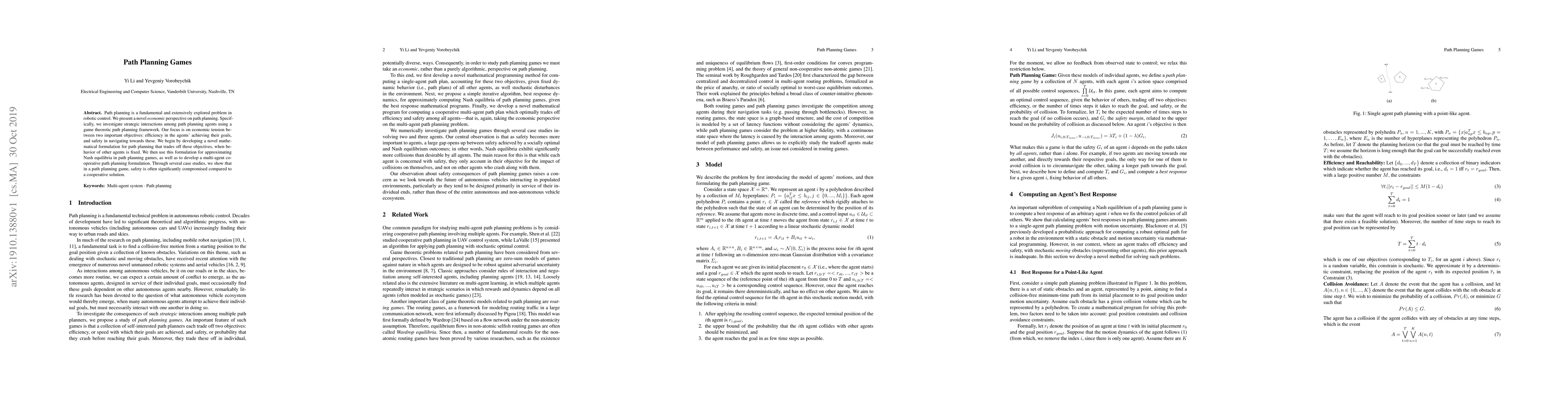 This paper introduces a game theoretic framework for path planning in robotics, balancing efficiency and safety through strategic interactions among agents. It proposes a mathematical model for approximating Nash equilibria and cooperative planning, demonstrating that safety is often sacrificed in non-cooperative scenarios.