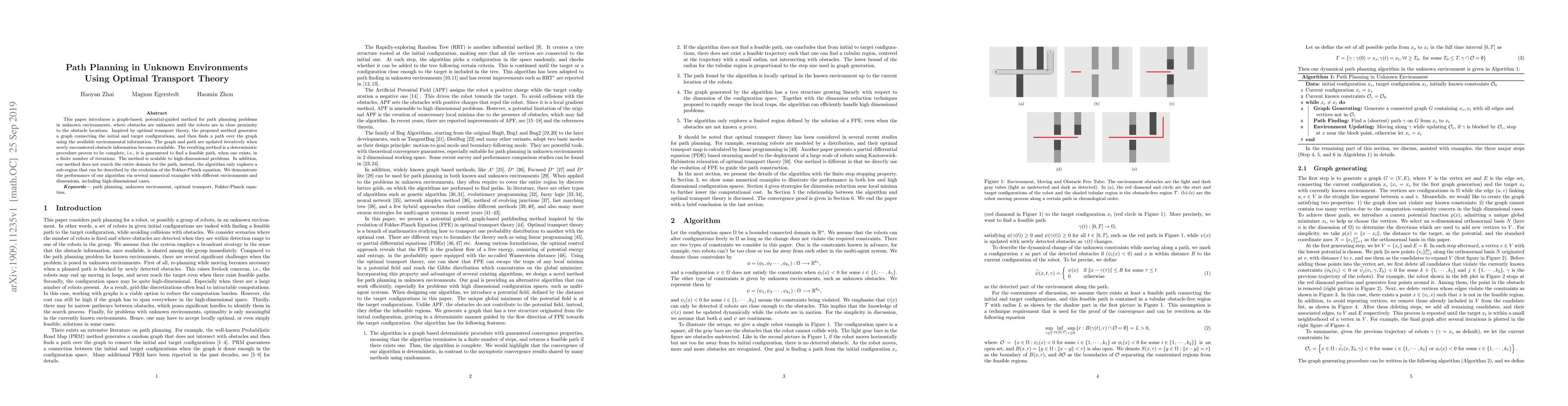 A new method for path planning in unknown environments uses optimal transport theory to generate a graph and find a path, updating it as new obstacle information becomes available. The approach is scalable, complete, and deterministic, with potential applications in robotics.