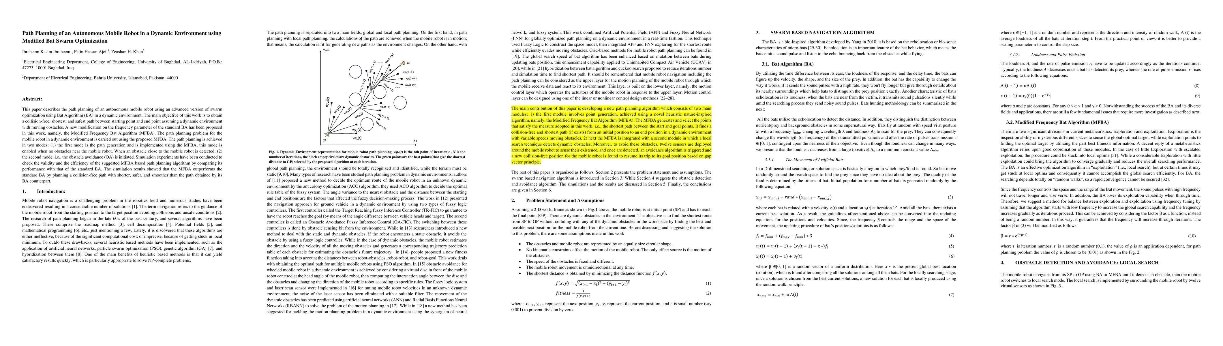 This paper proposes a Modified Frequency Bat Algorithm (MFBA) for path planning of autonomous mobile robots in dynamic environments, achieving shorter, safer, and smoother paths compared to the standard Bat Algorithm (BA). The MFBA operates in two modes: path generation and obstacle avoidance, demonstrating superior performance through simulation.