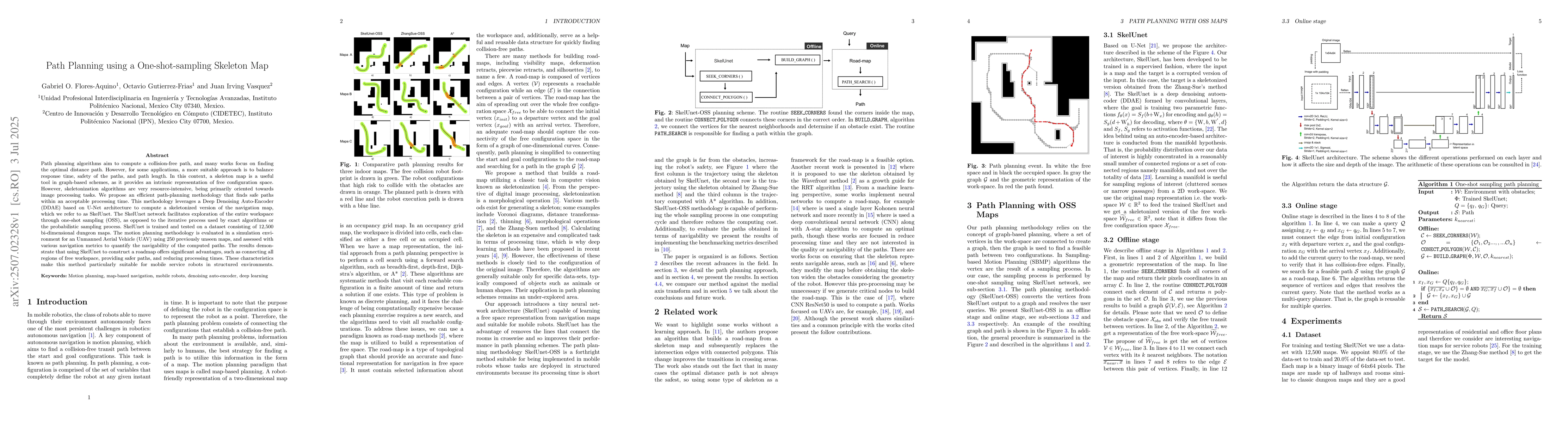 Path planning algorithms aim to compute a collision-free path, and many works focus on finding the optimal distance path. However, for some applications, a more suitable approach is to balance response time, safety of the paths, and path length. In this context, a skeleton map is a useful tool in graph-based schemes, as it provides an intrinsic representation of free configuration space. However, skeletonization algorithms are very resource-intensive, being primarily oriented towards image processing tasks. We propose an efficient path-planning methodology that finds safe paths within an acceptable processing time. This methodology leverages a Deep Denoising Auto-Encoder (DDAE) based on U-Net architecture to compute a skeletonized version of the navigation map, which we refer to as SkelUnet. The SkelUnet network facilitates exploration of the entire workspace through one-shot sampling (OSS), as opposed to the iterative process used by exact algorithms or the probabilistic sampling process. SkelUnet is trained and tested on a dataset consisting of 12,500 bi-dimensional dungeon maps. The motion planning methodology is evaluated in a simulation environment for an Unmanned Aerial Vehicle (UAV) using 250 previously unseen maps, and assessed with various navigation metrics to quantify the navigability of the computed paths. The results demonstrate that using SkelUnet to construct a roadmap offers significant advantages, such as connecting all regions of free workspace, providing safer paths, and reducing processing times. These characteristics make this method particularly suitable for mobile service robots in structured environments.