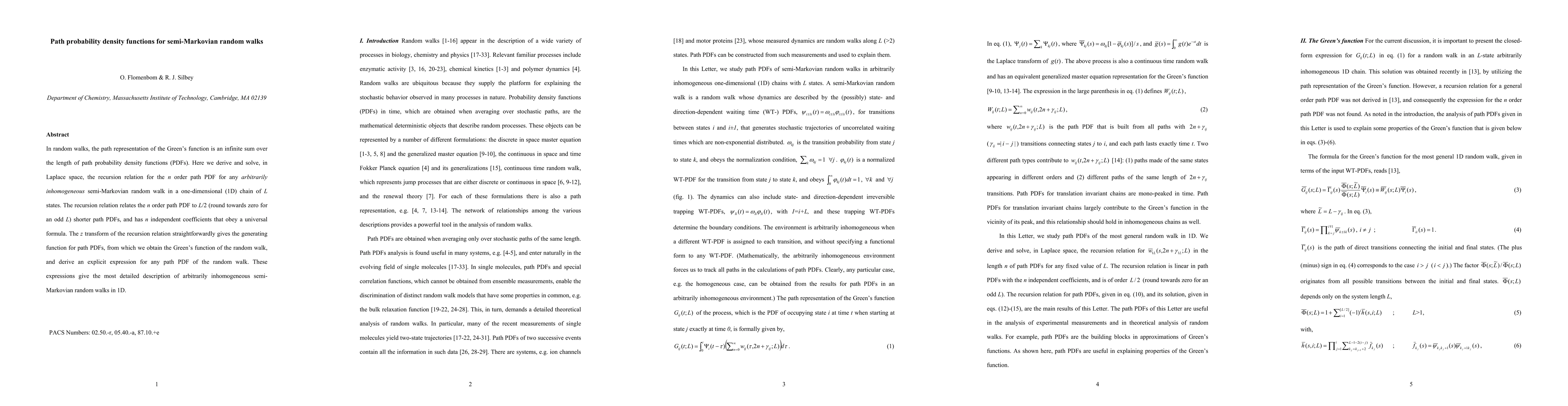 In random walks, the path representation of the Green's function is an infinite sum over the length of path probability density functions (PDFs). Here we derive and solve, in Laplace space, the recursion relation for the n order path PDF for any arbitrarily inhomogeneous semi-Markovian random walk in a one-dimensional (1D) chain of L states. The recursion relation relates the n order path PDF to L/2 (round towards zero for an odd L) shorter path PDFs, and has n independent coefficients that obey a universal formula. The z transform of the recursion relation straightforwardly gives the generating function for path PDFs, from which we obtain the Green's function of the random walk, and derive an explicit expression for any path PDF of the random walk. These expressions give the most detailed description of arbitrarily inhomogeneous semi-Markovian random walks in 1D.