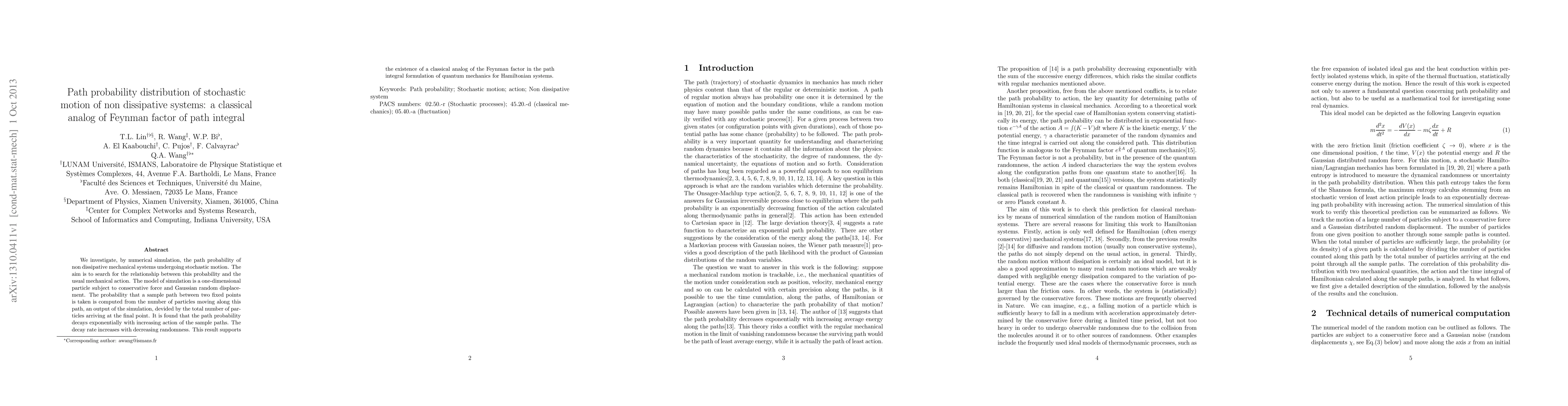 This research paper simulates stochastic motion of non-dissipative mechanical systems to find a relationship between path probability and mechanical action. It finds that the path probability decays exponentially with increasing action and supports the existence of a classical analog of Feynman factor in quantum mechanics.