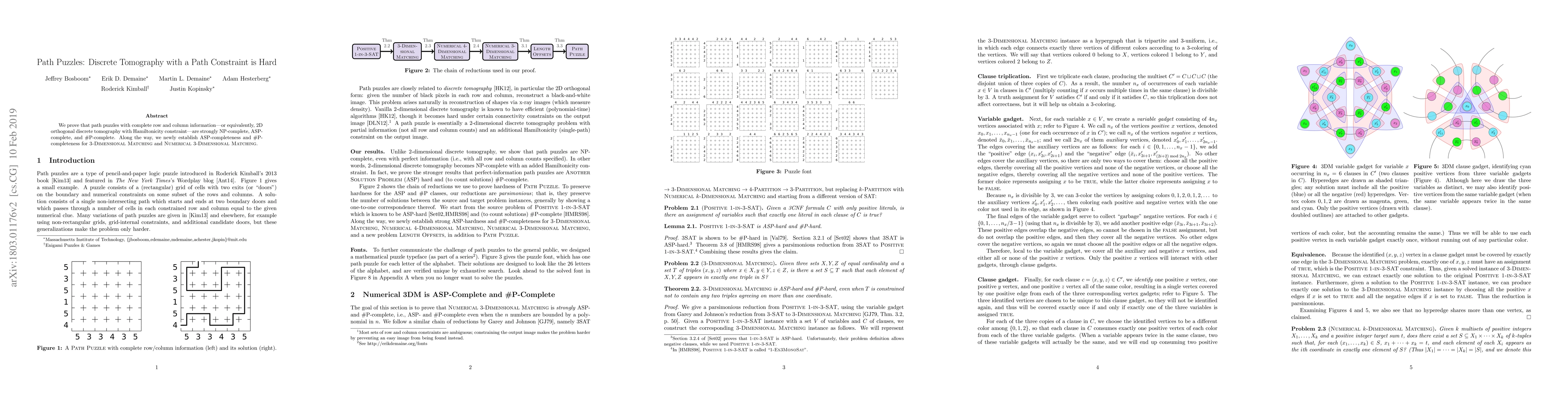 This paper demonstrates that solving path puzzles with complete row and column information, which corresponds to 2D orthogonal discrete tomography with a Hamiltonicity constraint, is strongly NP-complete, ASP-complete, and #P-complete. Additionally, it establishes ASP-completeness and #P-completeness for 3-Dimensional Matching and Numerical 3-Dimensional Matching.