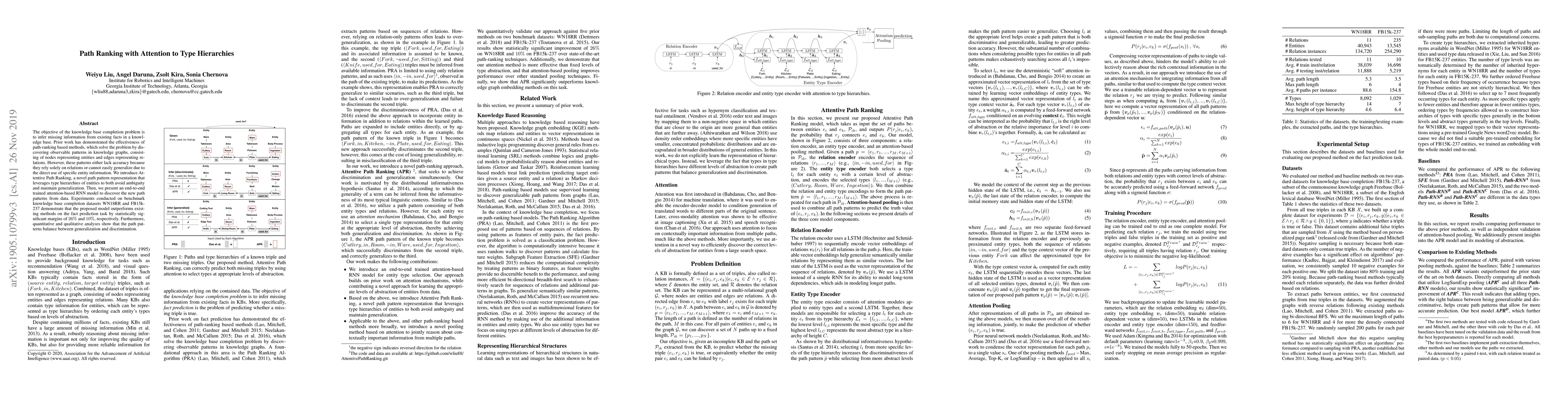 The paper proposes Attentive Path Ranking, a method that uses type hierarchies to improve knowledge base completion by discovering more accurate and generalizable path patterns, achieving significant improvements over existing methods on benchmark datasets. The model combines an attention-based RNN with path pattern representation to enhance performance in fact prediction tasks.