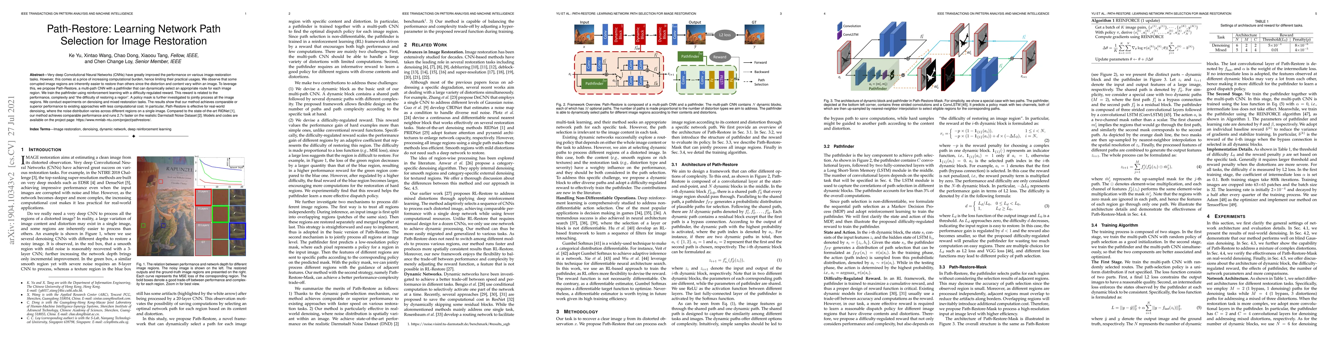 Very deep Convolutional Neural Networks (CNNs) have greatly improved the performance on various image restoration tasks. However, this comes at a price of increasing computational burden, hence limiting their practical usages. We observe that some corrupted image regions are inherently easier to restore than others since the distortion and content vary within an image. To leverage this, we propose Path-Restore, a multi-path CNN with a pathfinder that can dynamically select an appropriate route for each image region. We train the pathfinder using reinforcement learning with a difficulty-regulated reward. This reward is related to the performance, complexity and "the difficulty of restoring a region". A policy mask is further investigated to jointly process all the image regions. We conduct experiments on denoising and mixed restoration tasks. The results show that our method achieves comparable or superior performance to existing approaches with less computational cost. In particular, Path-Restore is effective for real-world denoising, where the noise distribution varies across different regions on a single image. Compared to the state-of-the-art RIDNet, our method achieves comparable performance and runs 2.7x faster on the realistic Darmstadt Noise Dataset.