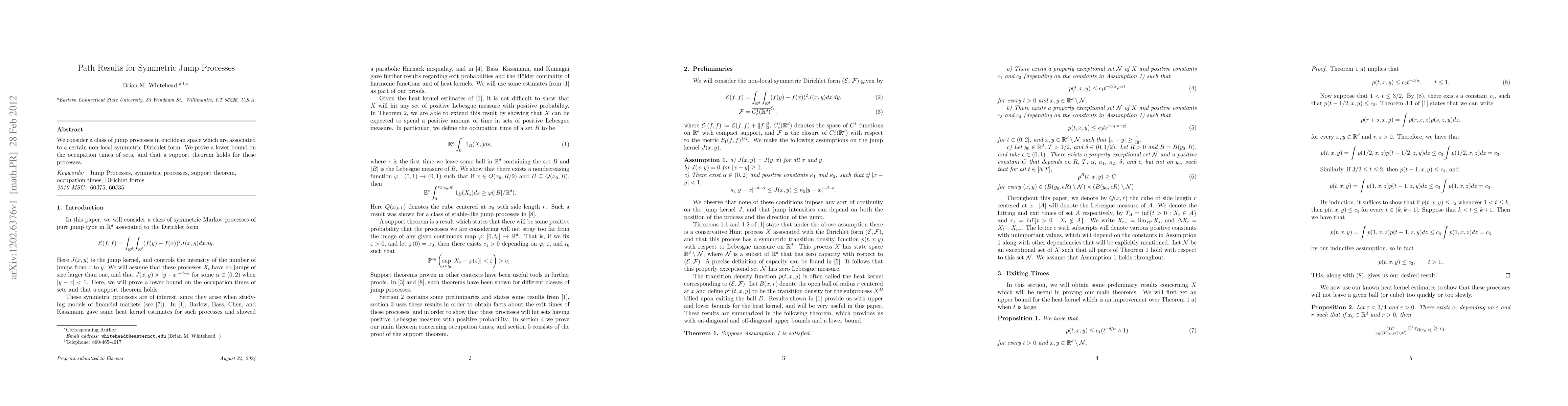 Summary: This paper investigates symmetric jump processes linked to a non-local symmetric Dirichlet form, proving a lower bound on occupation times and establishing a support theorem for these processes.