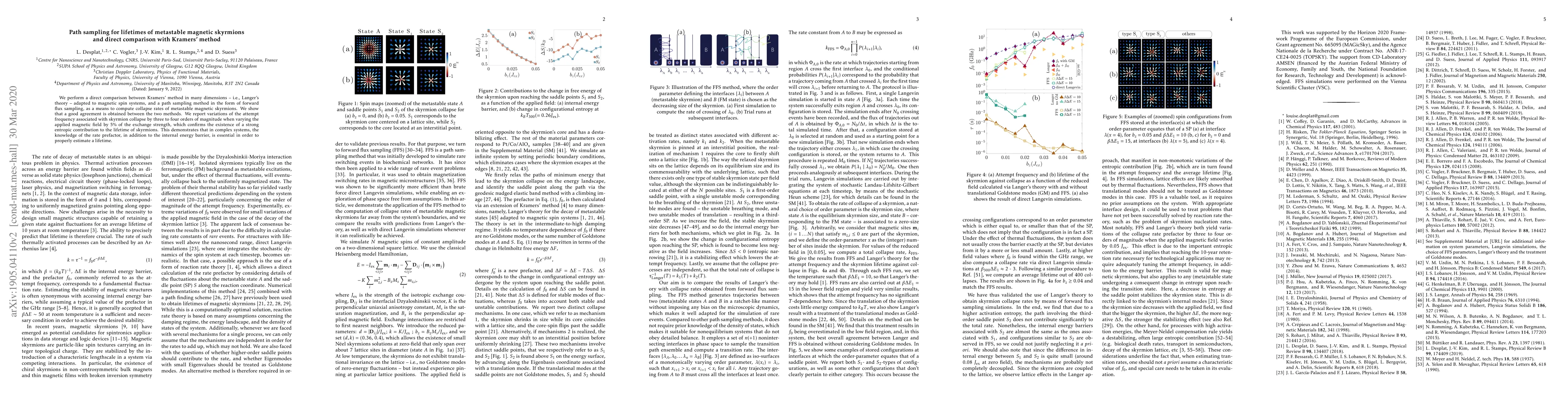 We perform a direct comparison between Kramers' method in many dimensions -- i.e., Langer's theory -- adapted to magnetic spin systems, and a path sampling method in the form of forward flux sampling, as a means to compute collapse rates of metastable magnetic skyrmions. We show that a good agreement is obtained between the two methods. We report variations of the attempt frequency associated with skyrmion collapse by three to four orders of magnitude when varying the applied magnetic field by 5$\%$ of the exchange strength, which confirms the existence of a strong entropic contribution to the lifetime of skyrmions. This demonstrates that in complex systems, the knowledge of the rate prefactor, in addition to the internal energy barrier, is essential in order to properly estimate a lifetime.
