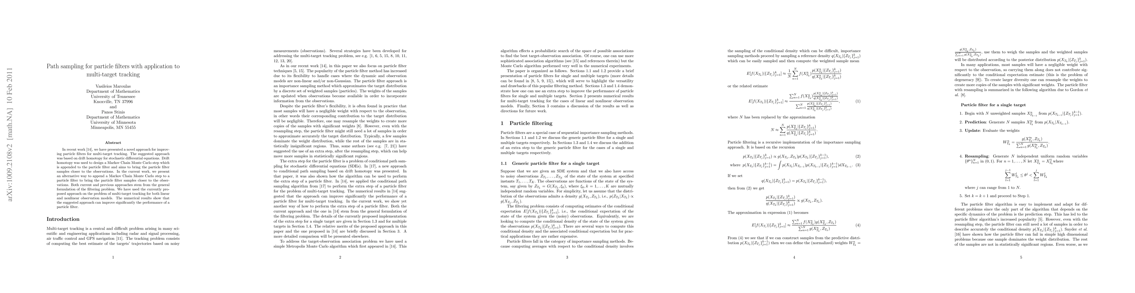In recent work (arXiv:1006.3100v1), we have presented a novel approach for improving particle filters for multi-target tracking. The suggested approach was based on drift homotopy for stochastic differential equations. Drift homotopy was used to design a Markov Chain Monte Carlo step which is appended to the particle filter and aims to bring the particle filter samples closer to the observations. In the current work, we present an alternative way to append a Markov Chain Monte Carlo step to a particle filter to bring the particle filter samples closer to the observations. Both current and previous approaches stem from the general formulation of the filtering problem. We have used the currently proposed approach on the problem of multi-target tracking for both linear and nonlinear observation models. The numerical results show that the suggested approach can improve significantly the performance of a particle filter.