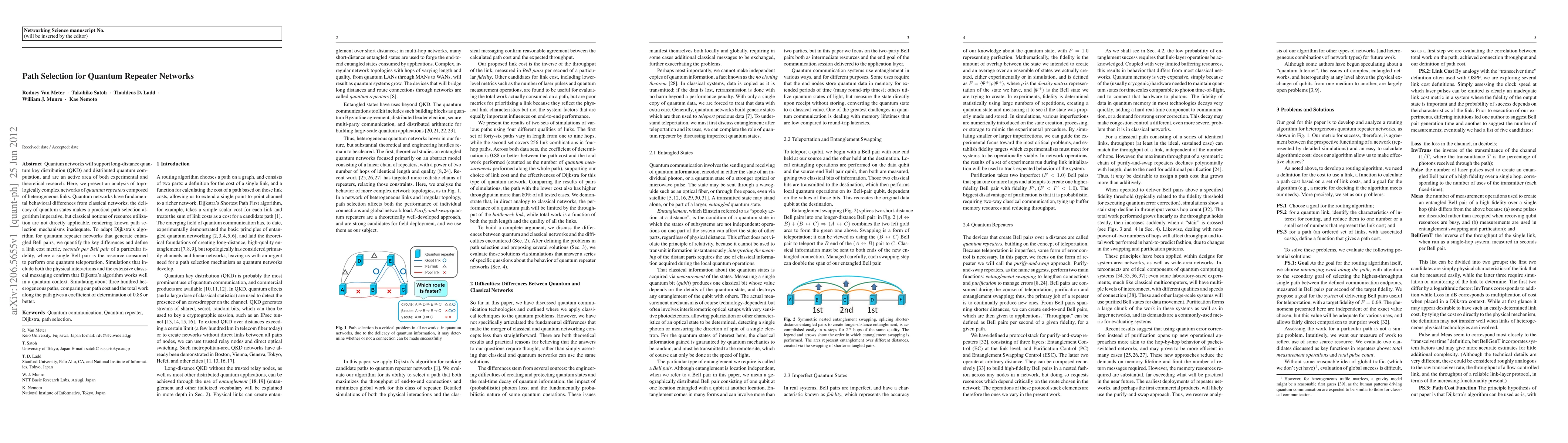 Quantum networks will support long-distance quantum key distribution (QKD) and distributed quantum computation, and are an active area of both experimental and theoretical research. Here, we present an analysis of topologically complex networks of quantum repeaters composed of heterogeneous links. Quantum networks have fundamental behavioral differences from classical networks; the delicacy of quantum states makes a practical path selection algorithm imperative, but classical notions of resource utilization are not directly applicable, rendering known path selection mechanisms inadequate. To adapt Dijkstra's algorithm for quantum repeater networks that generate entangled Bell pairs, we quantify the key differences and define a link cost metric, seconds per Bell pair of a particular fidelity, where a single Bell pair is the resource consumed to perform one quantum teleportation. Simulations that include both the physical interactions and the extensive classical messaging confirm that Dijkstra's algorithm works well in a quantum context. Simulating about three hundred heterogeneous paths, comparing our path cost and the total work along the path gives a coefficient of determination of 0.88 or better.