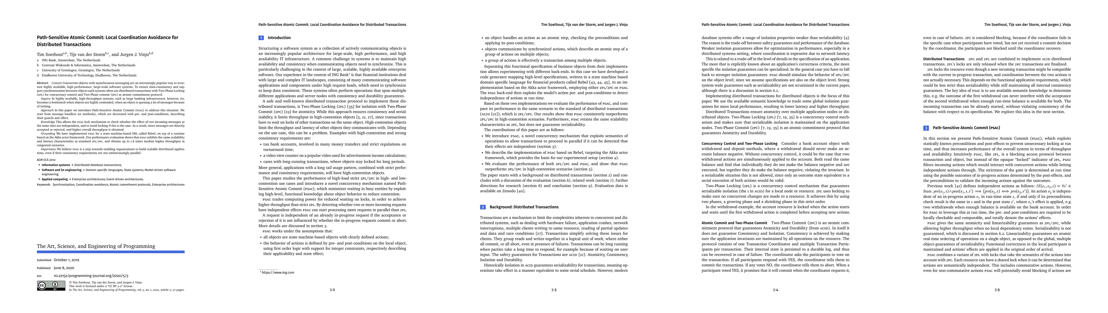 This paper introduces Path-Sensitive Atomic Commit (PSAC) to enhance the performance of distributed transactions in high-throughput systems by avoiding unnecessary locking. Implemented on top of the Akka actor framework, PSAC demonstrates up to 1.8 times higher throughput compared to traditional 2PL/2PC methods in congested scenarios.