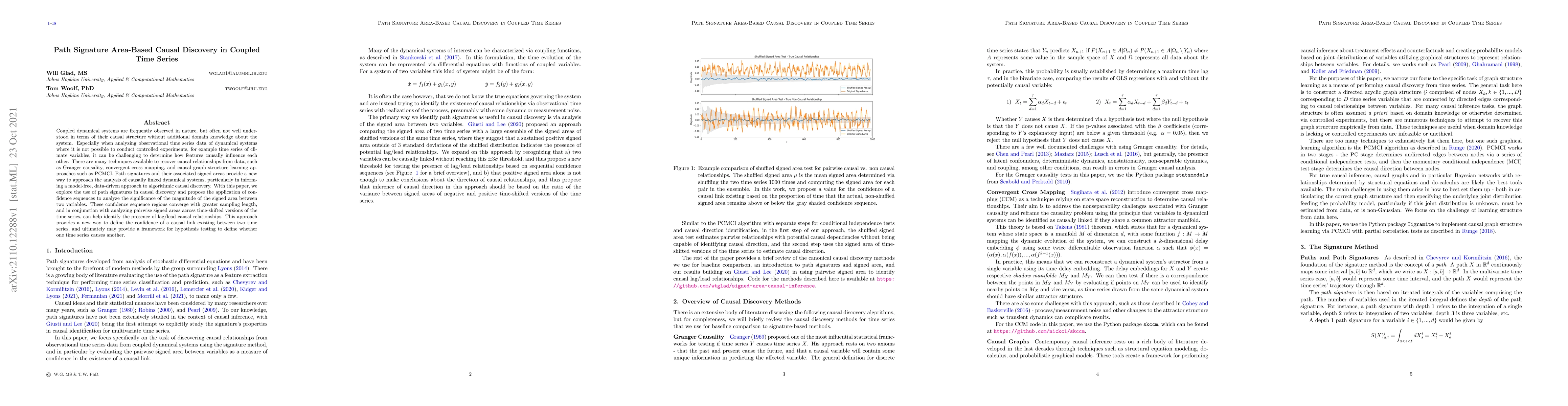 This paper proposes a novel method for causal discovery in coupled time series using path signatures and their signed areas, aiming to identify causal relationships without requiring domain knowledge. The method leverages confidence sequences to assess the significance of causal links and time-shifted analyses to detect lag/lead relationships.