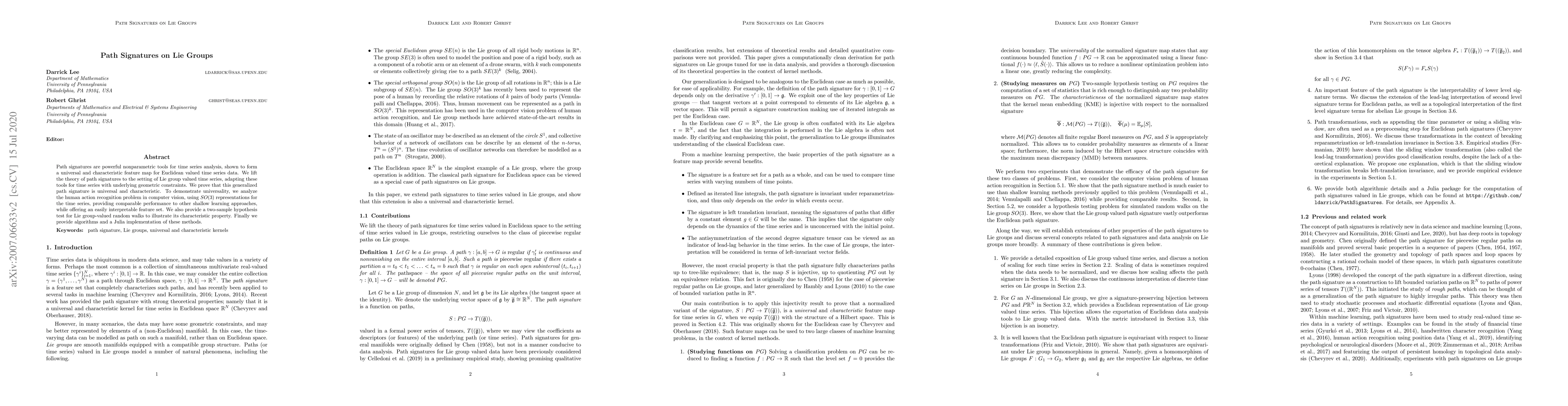 Path signatures are powerful nonparametric tools for time series analysis, shown to form a universal and characteristic feature map for Euclidean valued time series data. We lift the theory of path signatures to the setting of Lie group valued time series, adapting these tools for time series with underlying geometric constraints. We prove that this generalized path signature is universal and characteristic. To demonstrate universality, we analyze the human action recognition problem in computer vision, using $SO(3)$ representations for the time series, providing comparable performance to other shallow learning approaches, while offering an easily interpretable feature set. We also provide a two-sample hypothesis test for Lie group-valued random walks to illustrate its characteristic property. Finally we provide algorithms and a Julia implementation of these methods.