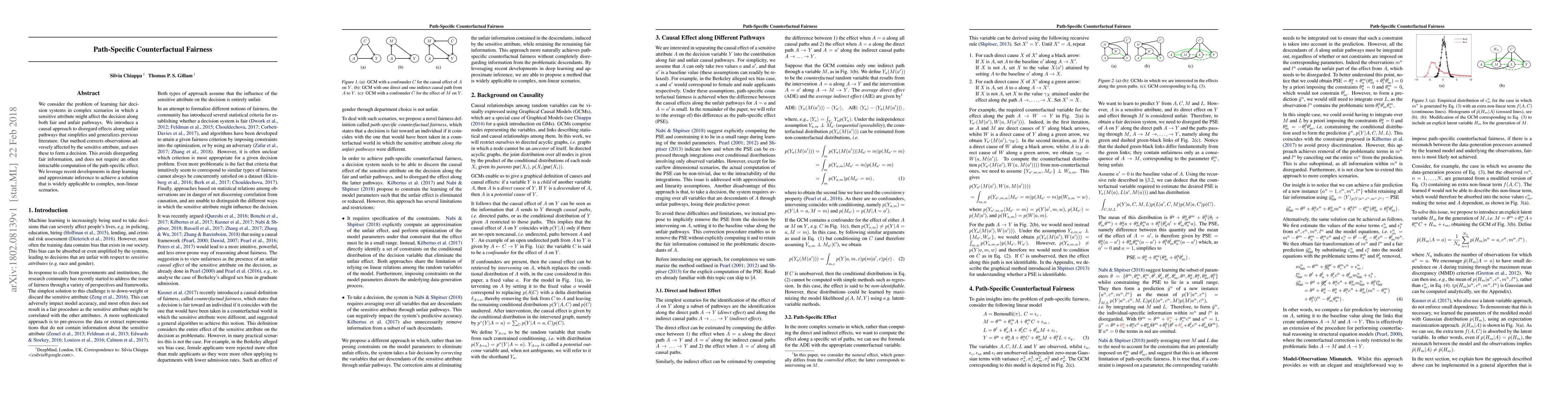 We consider the problem of learning fair decision systems in complex scenarios in which a sensitive attribute might affect the decision along both fair and unfair pathways. We introduce a causal approach to disregard effects along unfair pathways that simplifies and generalizes previous literature. Our method corrects observations adversely affected by the sensitive attribute, and uses these to form a decision. This avoids disregarding fair information, and does not require an often intractable computation of the path-specific effect. We leverage recent developments in deep learning and approximate inference to achieve a solution that is widely applicable to complex, non-linear scenarios.