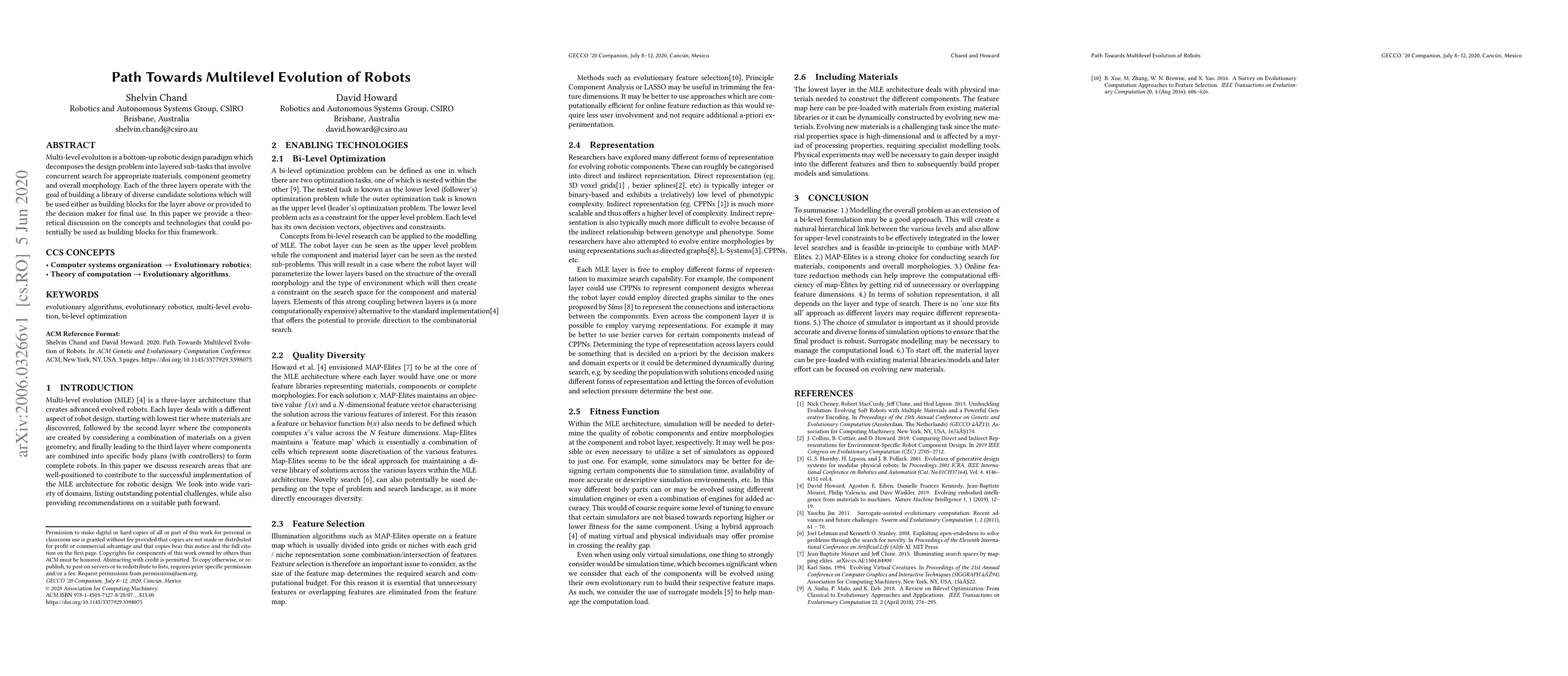 Multi-level evolution is a bottom-up robotic design paradigm which decomposes the design problem into layered sub-tasks that involve concurrent search for appropriate materials, component geometry and overall morphology. Each of the three layers operate with the goal of building a library of diverse candidate solutions which will be used either as building blocks for the layer above or provided to the decision maker for final use. In this paper we provide a theoretical discussion on the concepts and technologies that could potentially be used as building blocks for this framework.