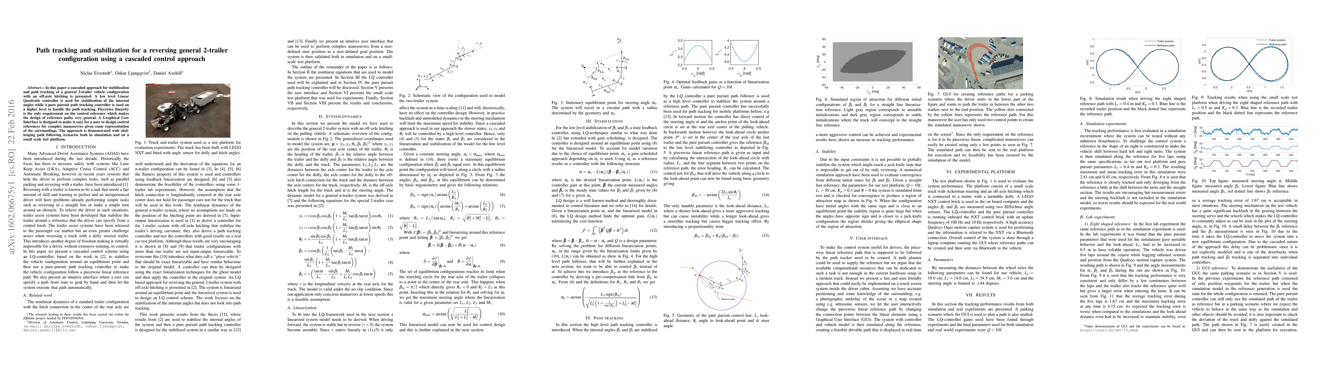 In this paper a cascaded approach for stabilization and path tracking of a general 2-trailer vehicle configuration with an off-axle hitching is presented. A low level Linear Quadratic controller is used for stabilization of the internal angles while a pure pursuit path tracking controller is used on a higher level to handle the path tracking. Piecewise linearity is the only requirement on the control reference which makes the design of reference paths very general. A Graphical User Interface is designed to make it easy for a user to design control references for complex manoeuvres given some representation of the surroundings. The approach is demonstrated with challenging path following scenarios both in simulation and on a small scale test platform.