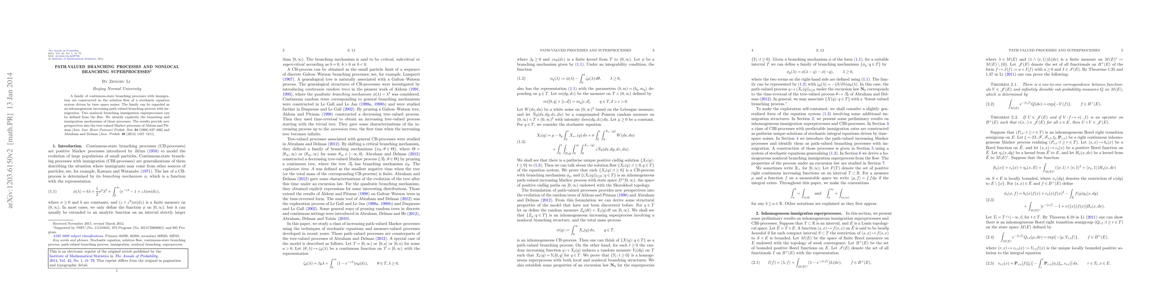 A family of continuous-state branching processes with immigration are constructed as the solution flow of a stochastic equation system driven by time-space noises. The family can be regarded as an inhomogeneous increasing path-valued branching process with immigration. Two nonlocal branching immigration superprocesses can be defined from the flow. We identify explicitly the branching and immigration mechanisms of those processes. The results provide new perspectives into the tree-valued Markov processes of Aldous and Pitman [Ann. Inst. Henri Poincar\'{e} Probab. Stat. 34 (1998) 637-686] and Abraham and Delmas [Ann. Probab. 40 (2012) 1167-1211].