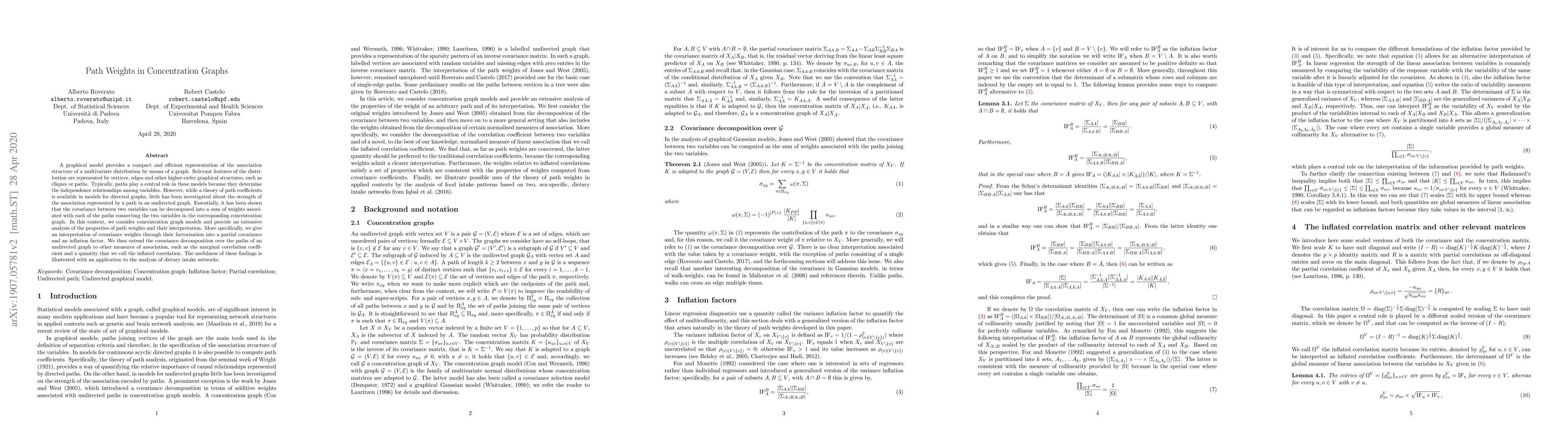 A graphical model provides a compact and efficient representation of the association structure of a multivariate distribution by means of a graph. Relevant features of the distribution are represented by vertices, edges and other higher-order graphical structures, such as cliques or paths. Typically, paths play a central role in these models because they determine the independence relationships among variables. However, while a theory of path coefficients is available in models for directed graphs, little has been investigated about the strength of the association represented by a path in an undirected graph. Essentially, it has been shown that the covariance between two variables can be decomposed into a sum of weights associated with each of the paths connecting the two variables in the corresponding concentration graph. In this context, we consider concentration graph models and provide an extensive analysis of the properties of path weights and their interpretation. More specifically, we give an interpretation of covariance weights through their factorisation into a partial covariance and an inflation factor. We then extend the covariance decomposition over the paths of an undirected graph to other measures of association, such as the marginal correlation coefficient and a quantity that we call the inflated correlation. The usefulness of these findings is illustrated with an application to the analysis of dietary intake networks.