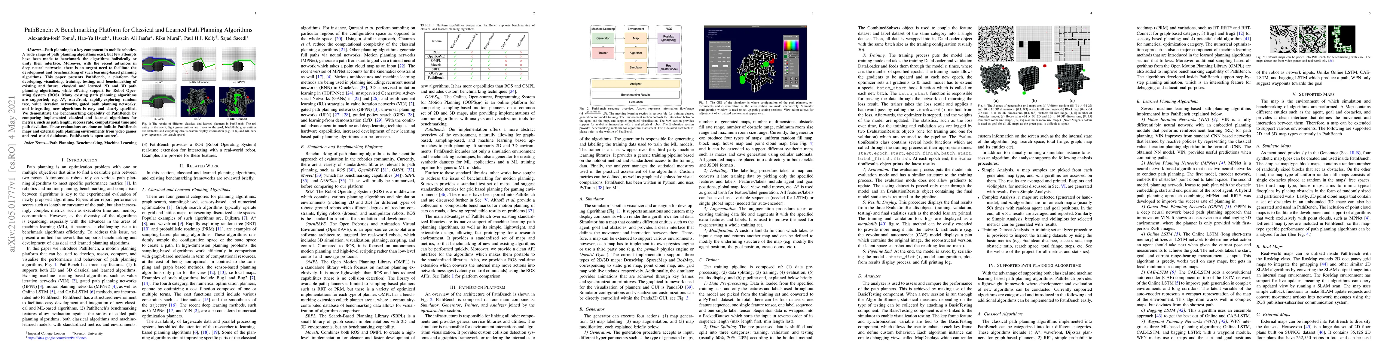 PathBench is an open-source benchmarking platform for both classical and learned path planning algorithms, facilitating their development, visualization, and comparison across various metrics like path length and computational time. It supports integration with ROS and includes a range of existing algorithms for evaluation.