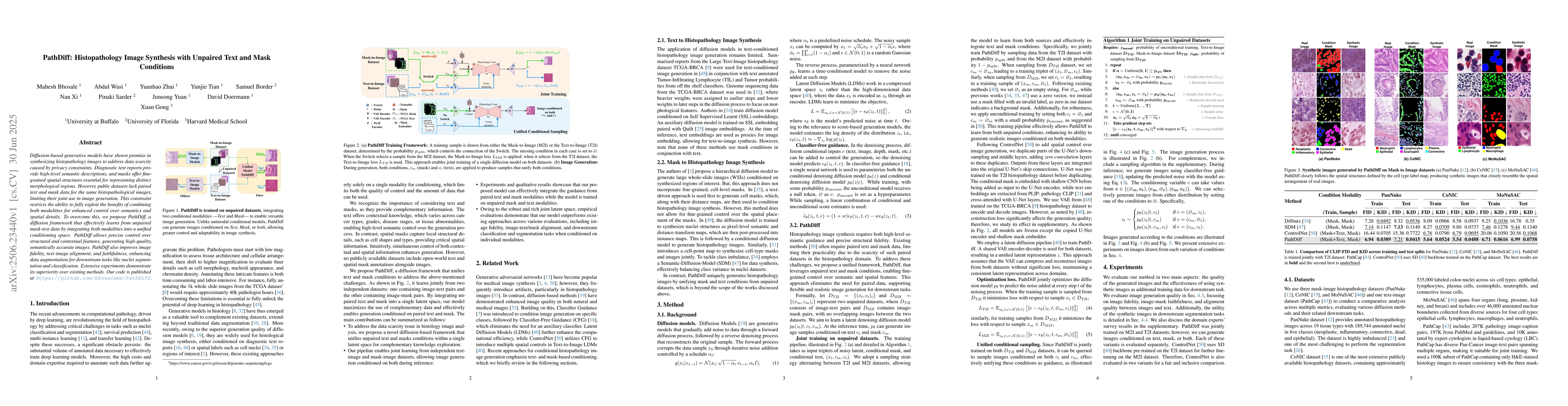 The research introduces PathDiff, a diffusion-based generative model for synthesizing histopathology images using unpaired text and mask data. PathDiff creates high-quality images with precise control over structural and contextual features, surpassing existing methods in image fidelity, text-image alignment, and faithfulness, thereby enhancing downstream tasks like nuclei segmentation and classification.