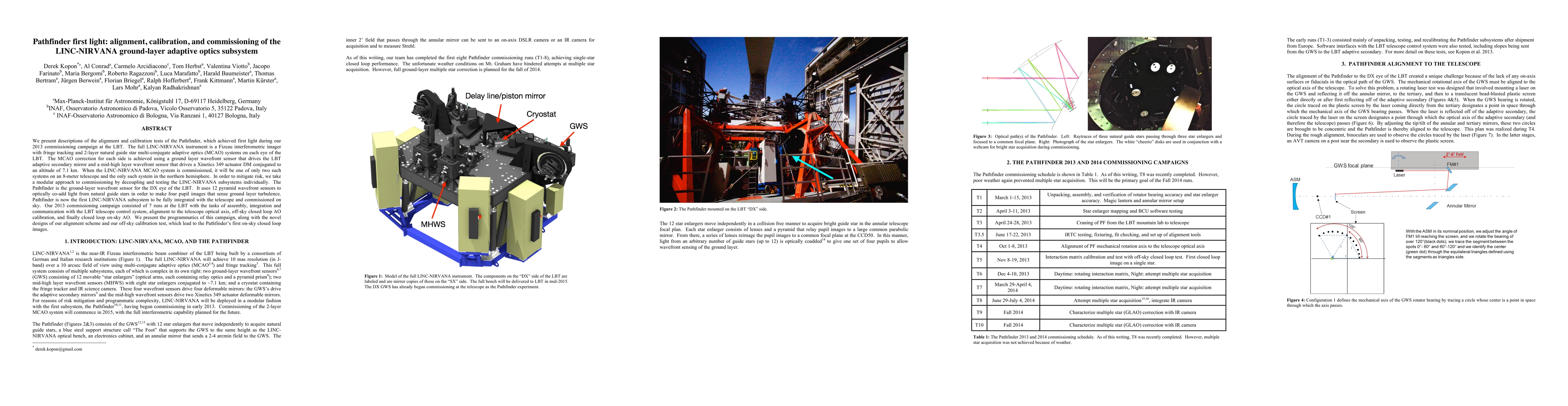 We present descriptions of the alignment and calibration tests of the Pathfinder, which achieved first light during our 2013 commissioning campaign at the LBT. The full LINC-NIRVANA instrument is a Fizeau interferometric imager with fringe tracking and 2-layer natural guide star multi-conjugate adaptive optics (MCAO) systems on each eye of the LBT. The MCAO correction for each side is achieved using a ground layer wavefront sensor that drives the LBT adaptive secondary mirror and a mid-high layer wavefront sensor that drives a Xinetics 349 actuator DM conjugated to an altitude of 7.1 km. When the LINC-NIRVANA MCAO system is commissioned, it will be one of only two such systems on an 8-meter telescope and the only such system in the northern hemisphere. In order to mitigate risk, we take a modular approach to commissioning by decoupling and testing the LINC-NIRVANA subsystems individually. The Pathfinder is the ground-layer wavefront sensor for the DX eye of the LBT. It uses 12 pyramid wavefront sensors to optically co-add light from natural guide stars in order to make four pupil images that sense ground layer turbulence. Pathfinder is now the first LINC-NIRVANA subsystem to be fully integrated with the telescope and commissioned on sky. Our 2013 commissioning campaign consisted of 7 runs at the LBT with the tasks of assembly, integration and communication with the LBT telescope control system, alignment to the telescope optical axis, off-sky closed loop AO calibration, and finally closed loop on-sky AO. We present the programmatics of this campaign, along with the novel designs of our alignment scheme and our off-sky calibration test, which lead to the Pathfinder's first on-sky closed loop images.
