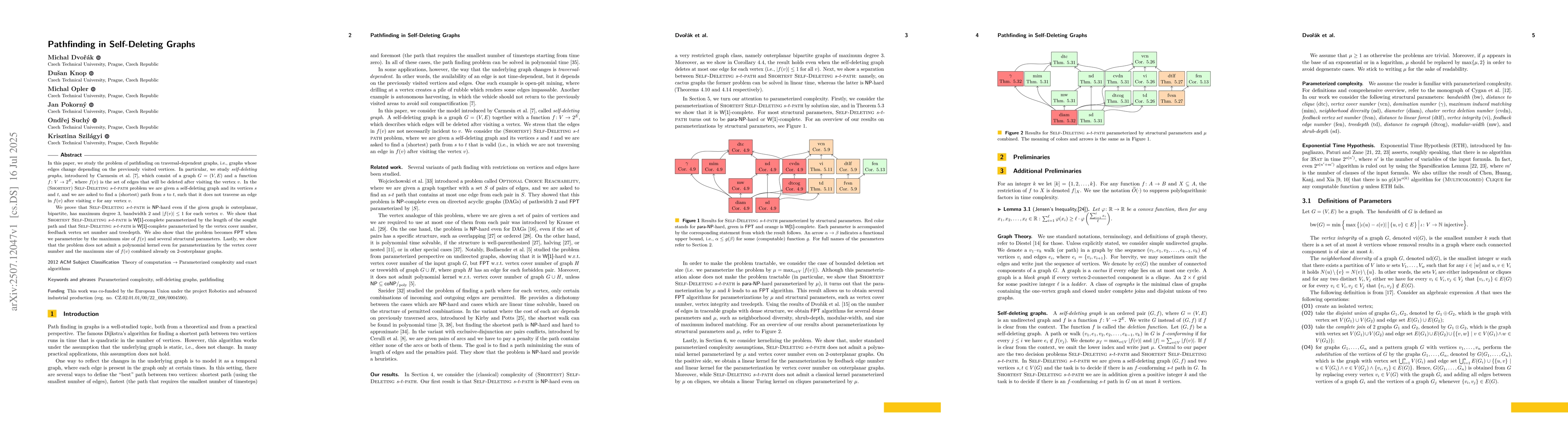 In this paper, we study the problem of pathfinding on traversal-dependent graphs, i.e., graphs whose edges change depending on the previously visited vertices. In particular, we study \emph{self-deleting graphs}, introduced by Carmesin et al. (Sarah Carmesin, David Woller, David Parker, Miroslav Kulich, and Masoumeh Mansouri. The Hamiltonian cycle and travelling salesperson problems with traversal-dependent edge deletion. J. Comput. Sci.), which consist of a graph $G=(V, E)$ and a function $f\colon V\rightarrow 2^E$, where $f(v)$ is the set of edges that will be deleted after visiting the vertex $v$. In the \textsc{(Shortest) Self-Deleting $s$-$t$-path} problem we are given a self-deleting graph and its vertices $s$ and $t$, and we are asked to find a (shortest) path from $s$ to $t$, such that it does not traverse an edge in $f(v)$ after visiting $v$ for any vertex $v$. We prove that \textsc{Self-Deleting $s$-$t$-path} is NP-hard even if the given graph is outerplanar, bipartite, has maximum degree $3$, bandwidth $2$ and $|f(v)|\leq 1$ for each vertex $v$. We show that \textsc{Shortest Self-Deleting $s$-$t$-path} is W[1]-complete parameterized by the length of the sought path and that \textsc{Self-Deleting $s$-$t$-path} is \W{1}-complete parameterized by the vertex cover number, feedback vertex set number and treedepth. We also show that the problem becomes FPT when we parameterize by the maximum size of $f(v)$ and several structural parameters. Lastly, we show that the problem does not admit a polynomial kernel even for parameterization by the vertex cover number and the maximum size of $f(v)$ combined already on 2-outerplanar graphs.