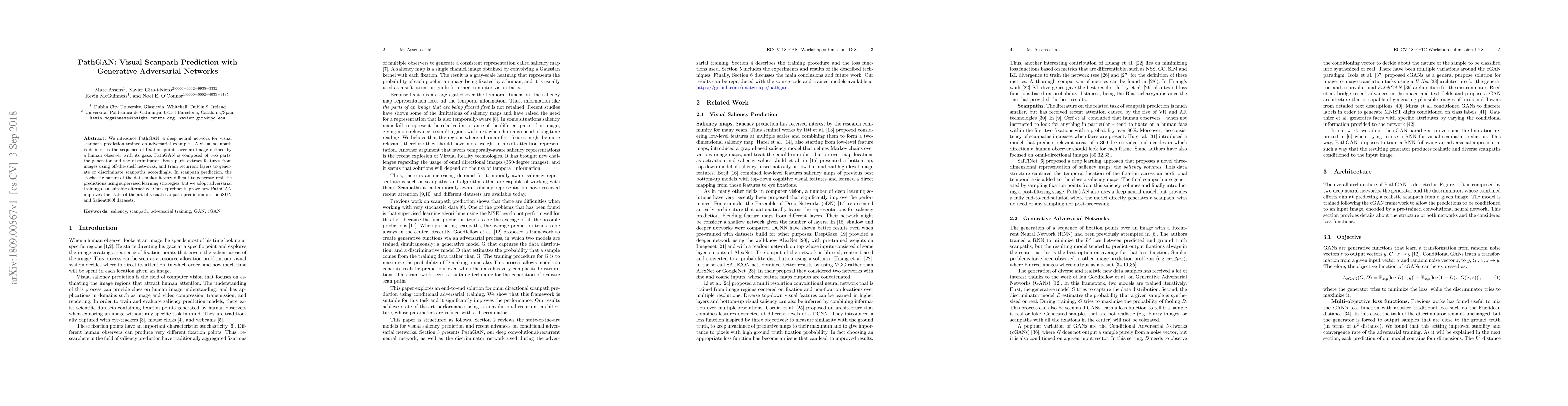 PathGAN employs a generative adversarial network (GAN) to predict visual scanpaths, the sequence of gaze fixations in images. It outperforms existing methods on iSUN and Salient360 datasets, leveraging adversarial training to handle the stochastic nature of scanpath data.
