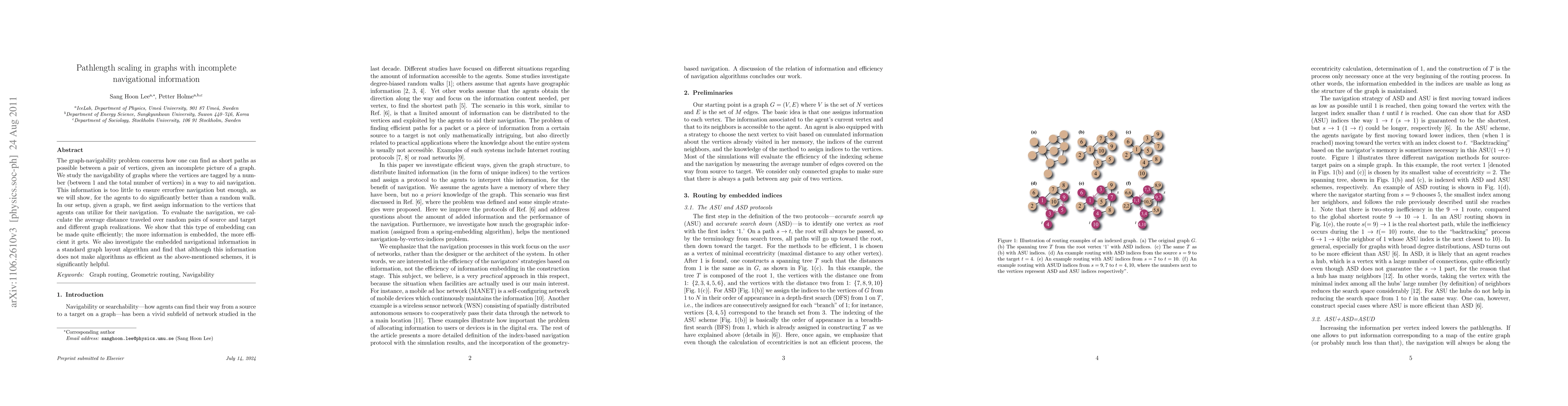 The graph-navigability problem concerns how one can find as short paths as possible between a pair of vertices, given an incomplete picture of a graph. We study the navigability of graphs where the vertices are tagged by a number (between 1 and the total number of vertices) in a way to aid navigation. This information is too little to ensure errorfree navigation but enough, as we will show, for the agents to do significantly better than a random walk. In our setup, given a graph, we first assign information to the vertices that agents can utilize for their navigation. To evaluate the navigation, we calculate the average distance traveled over random pairs of source and target and different graph realizations. We show that this type of embedding can be made quite efficiently; the more information is embedded, the more efficient it gets. We also investigate the embedded navigational information in a standard graph layout algorithm and find that although this information does not make algorithms as efficient as the above-mentioned schemes, it is significantly helpful.