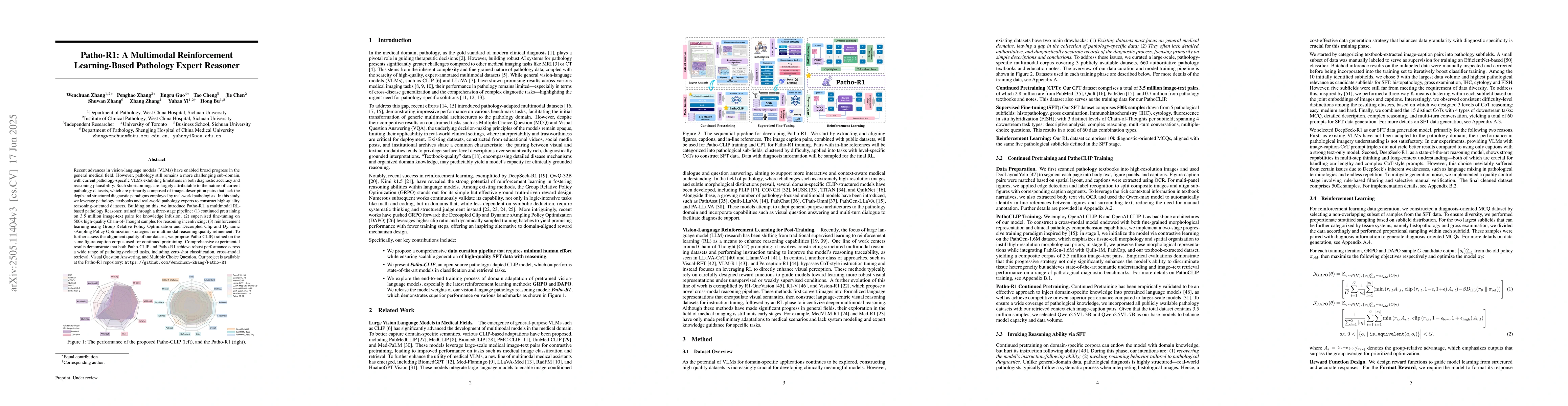 Patho-R1, a multimodal reinforcement learning-based pathology expert reasoner, trained through a three-stage pipeline, and PathoCLIP, a model assessing dataset alignment quality.