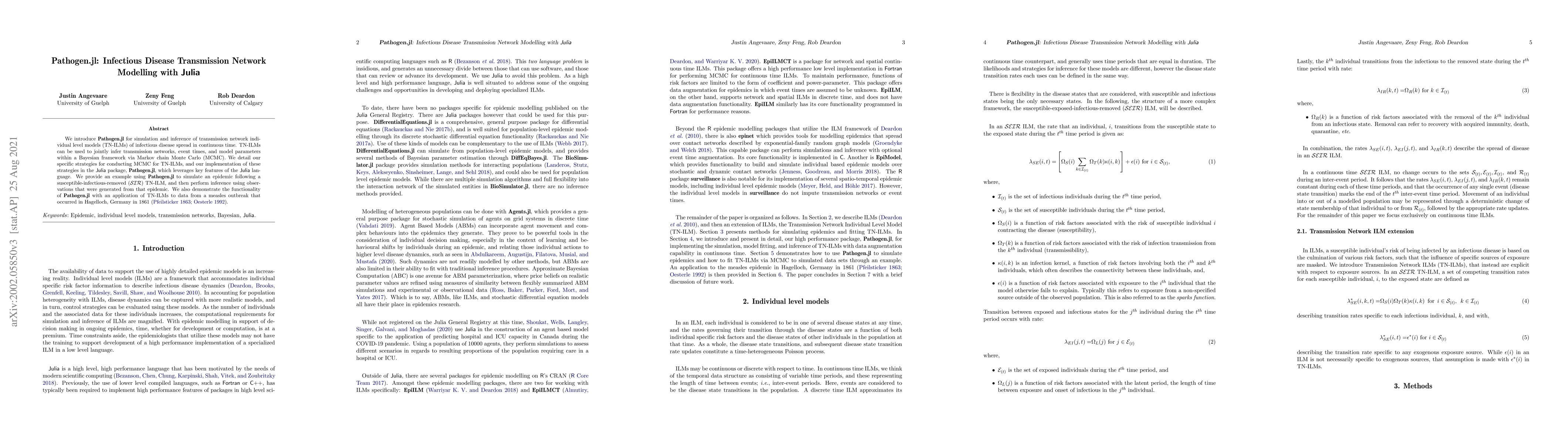 We introduce Pathogen.jl for simulation and inference of transmission network individual level models (TN-ILMs) of infectious disease spread in continuous time. TN-ILMs can be used to jointly infer transmission networks, event times, and model parameters within a Bayesian framework via Markov chain Monte Carlo (MCMC). We detail our specific strategies for conducting MCMC for TN-ILMs, and our implementation of these strategies in the Julia package, Pathogen.jl, which leverages key features of the Julia language. We provide an example using Pathogen.jl to simulate an epidemic following a susceptible-infectious-removed (SIR) TN-ILM, and then perform inference using observations that were generated from that epidemic. We also demonstrate the functionality of Pathogen.jl with an application of TN-ILMs to data from a measles outbreak that occurred in Hagelloch, Germany in 1861(Pfeilsticker 1863; Oesterle 1992).