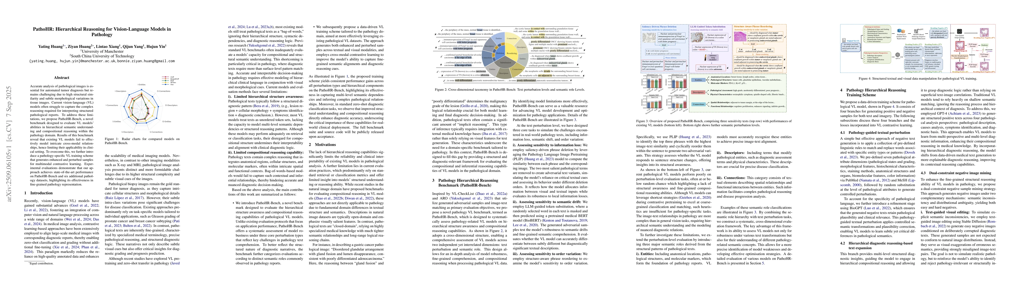 Accurate analysis of pathological images is essential for automated tumor diagnosis but remains challenging due to high structural similarity and subtle morphological variations in tissue images. Current vision-language (VL) models often struggle to capture the complex reasoning required for interpreting structured pathological reports. To address these limitations, we propose PathoHR-Bench, a novel benchmark designed to evaluate VL models' abilities in hierarchical semantic understanding and compositional reasoning within the pathology domain. Results of this benchmark reveal that existing VL models fail to effectively model intricate cross-modal relationships, hence limiting their applicability in clinical setting. To overcome this, we further introduce a pathology-specific VL training scheme that generates enhanced and perturbed samples for multimodal contrastive learning. Experimental evaluations demonstrate that our approach achieves state-of-the-art performance on PathoHR-Bench and six additional pathology datasets, highlighting its effectiveness in fine-grained pathology representation.