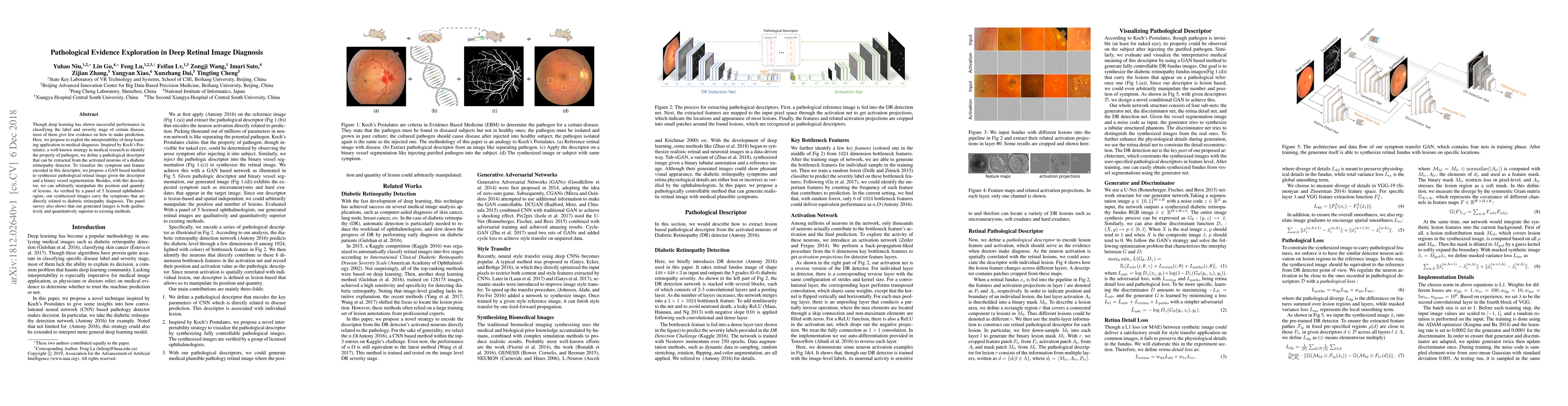 Though deep learning has shown successful performance in classifying the label and severity stage of certain disease, most of them give few evidence on how to make prediction. Here, we propose to exploit the interpretability of deep learning application in medical diagnosis. Inspired by Koch's Postulates, a well-known strategy in medical research to identify the property of pathogen, we define a pathological descriptor that can be extracted from the activated neurons of a diabetic retinopathy detector. To visualize the symptom and feature encoded in this descriptor, we propose a GAN based method to synthesize pathological retinal image given the descriptor and a binary vessel segmentation. Besides, with this descriptor, we can arbitrarily manipulate the position and quantity of lesions. As verified by a panel of 5 licensed ophthalmologists, our synthesized images carry the symptoms that are directly related to diabetic retinopathy diagnosis. The panel survey also shows that our generated images is both qualitatively and quantitatively superior to existing methods.
