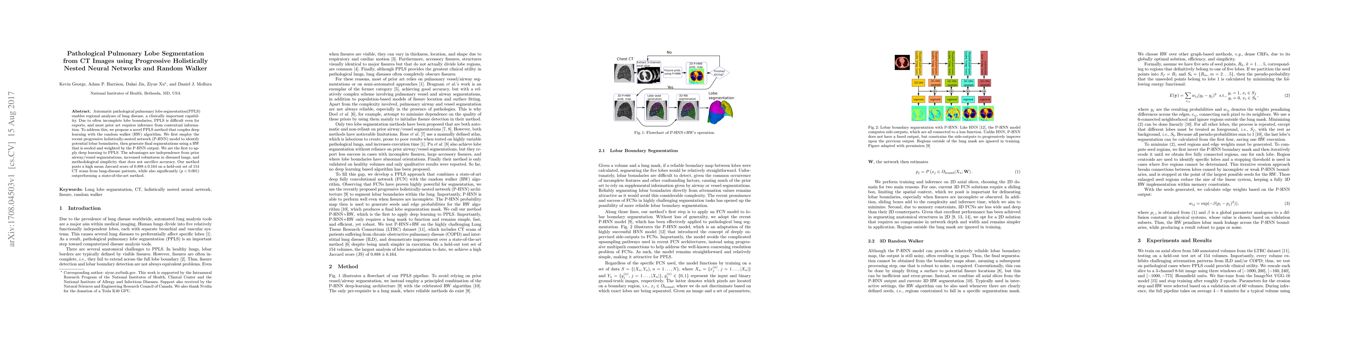 This paper proposes a novel method for automatic pathological pulmonary lobe segmentation using a combination of progressive holistically nested neural networks and a random walker algorithm, achieving high accuracy and robustness, especially in diseased lungs, with a mean Jaccard score of 0.888±0.164. The method outperforms existing techniques and does not rely on prior airway or vessel segmentations.
