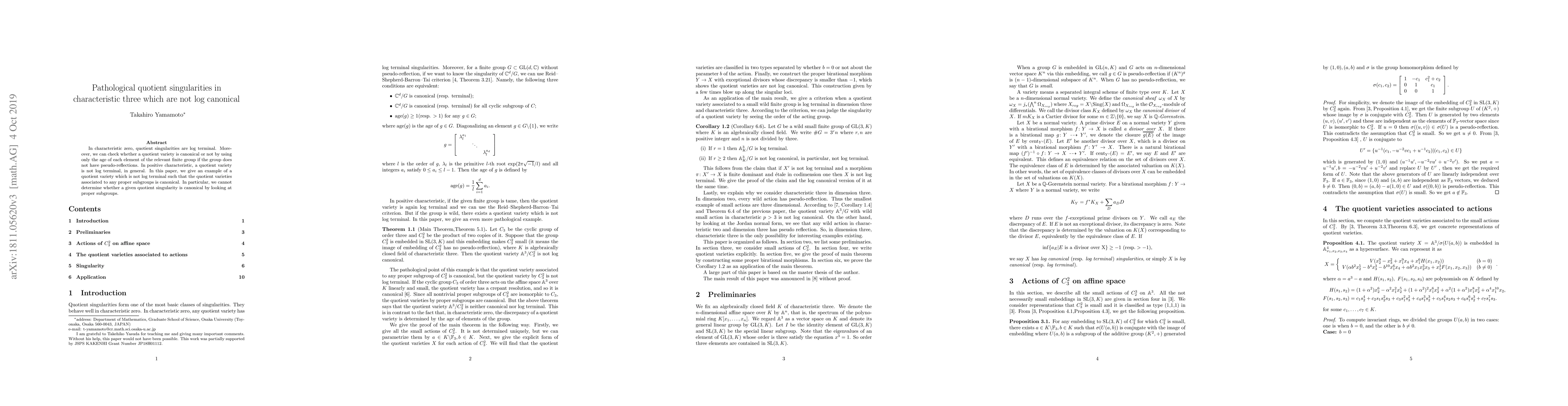 This paper presents an example of a pathological quotient singularity in characteristic three that is not log canonical, demonstrating that proper subgroups' canonical status does not determine the singularity's canonical nature. It highlights the difference in behavior between quotient singularities in characteristic zero and positive characteristic.
