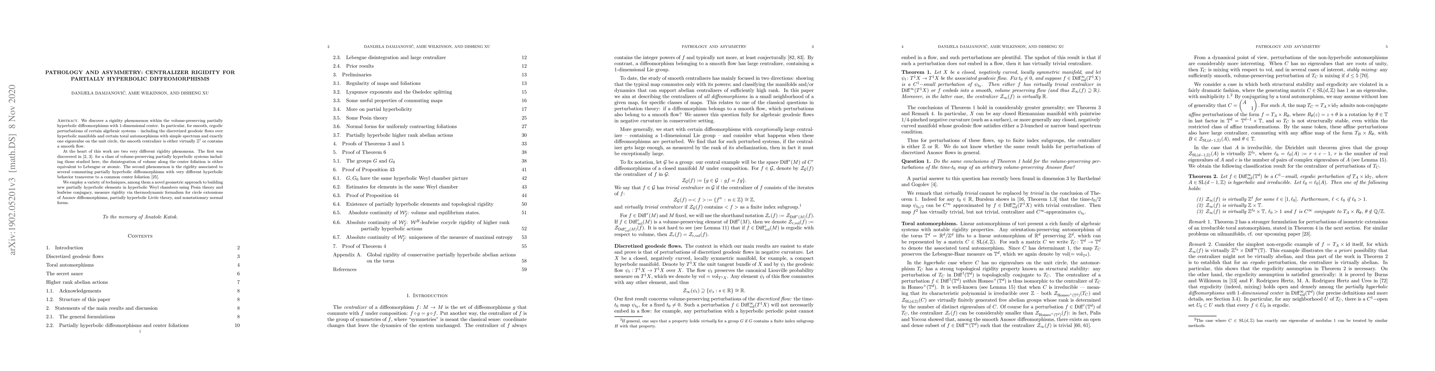 We discover a rigidity phenomenon within the volume-preserving partially hyperbolic diffeomorphisms with $1$-dimensional center. In particular, for smooth, ergodic perturbations of certain algebraic systems -- including the discretized geodesic flows over hyperbolic manifolds and certain toral automorphisms with simple spectrum and exactly one eigenvalue on the unit circle, the smooth centralizer is either virtually $\mathbb Z^\ell$ or contains a smooth flow. At the heart of this work are two very different rigidity phenomena. The first was discovered in [2,3] for a class of volume-preserving partially hyperbolic systems including those studied here, the disintegration of volume along the center foliation is either equivalent to Lebesgue or atomic. The second phenomenon is the rigidity associated to several commuting partially hyperbolic diffeomorphisms with very different hyperbolic behavior transverse to a common center foliation [25]. We introduce a variety of techniques in the study of higher rank, abelian partially hyperbolic actions: most importantly, we demonstrate a novel geometric approach to building new partially hyperbolic elements in hyperbolic Weyl chambers using Pesin theory and leafwise conjugacy, while we also treat measure rigidity for circle extensions of Anosov diffeomorphisms and apply normal form theory to upgrade regularity of the centralizer.
