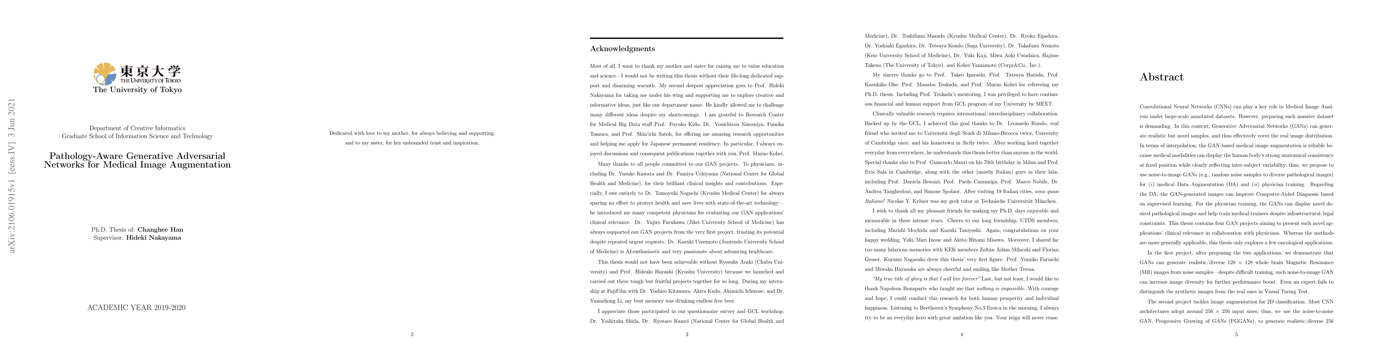 Convolutional Neural Networks (CNNs) can play a key role in Medical Image Analysis under large-scale annotated datasets. However, preparing such massive dataset is demanding. In this context, Generative Adversarial Networks (GANs) can generate realistic but novel samples, and thus effectively cover the real image distribution. In terms of interpolation, the GAN-based medical image augmentation is reliable because medical modalities can display the human body's strong anatomical consistency at fixed position while clearly reflecting inter-subject variability; thus, we propose to use noise-to-image GANs (e.g., random noise samples to diverse pathological images) for (i) medical Data Augmentation (DA) and (ii) physician training. Regarding the DA, the GAN-generated images can improve Computer-Aided Diagnosis based on supervised learning. For the physician training, the GANs can display novel desired pathological images and help train medical trainees despite infrastructural/legal constraints. This thesis contains four GAN projects aiming to present such novel applications' clinical relevance in collaboration with physicians. Whereas the methods are more generally applicable, this thesis only explores a few oncological applications.